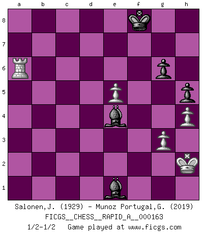 Last move : 1/2-1/2 2014 October 12 4:44:13 [Event "FICGS__CHESS__RAPID_A__000163"] [Site "FICGS"] [Date "2014.07.17"] [Round "1"] [White "Salonen,Jukka"] [Black "Munoz Portugal,Guillermo"] [Result "1/2-1/2"] [WhiteElo "1929"] [BlackElo "2019"] 1.d4 Nf6 2.c4 e6 3.Nf3 b6 4.e3 Bb7 5.Bd3 d5 6.O-O Bd6 7.Nc3 O-O 8.b3 dxc4 9.bxc4 c5 10.h3 cxd4 11.exd4 Nc6 12.Rb1 Rc8 13.Nb5 Be7 14.Re1 a6 15.Nc3 b5 16.c5 Qc7 17.Be3 Rfd8 18.Qd2 g6 19.Rbc1 e5 20.Nxe5 Nxe5 21.dxe5 Qxe5 22.c6 Rxc6 23.Bb6 Qd6 24.Bxd8 Bxd8 25.Qe2 Bc7 26.g3 Bb6 27.Kh2 Qd4 28.Ne4 Re6 29.f3 Nd5 30.a4 f5 31.axb5 axb5 32.Qa2 fxe4 33.Bxe4 b4 34.Re2 Kh8 35.Rd2 Nc3 36.Qb2 Qg7 37.Qxb4 Nxe4 38.fxe4 Qe7 39.Qc3+ Kg8 40.Rb1 h5 41.h4 Ba6 42.Rc2 Kh7 43.e5 Qd7 44.Qb3 Bb7 45.Re1 Kg7 46.Qb2 Qd3 47.Rd2 Qf3 48.Rd7+ Kf8 49.Qd2 Bc6 50.Qh6+ Ke8 51.Rd2 Ba5 52.Qh8+ Qf8 53.Qxf8+ Kxf8 54.Rd6 Bxe1 55.Rxe6 Be4 56.Ra6 1/2-1/2 Queen's Indian : 4.e3 Kingside Castling by player White (move 6) Kingside Castling by player Black (move 7) 10 pieces endgame at move 55 : White KRPPP , Black KBBPP WHITE : King + 1 Rook 3 Pawns BLACK : King + 2 Bishops 2 Pawns This chess game ended in a draw. Follow this game move after move (download)Chess books should be used as we use glasses: to assist the sight, although some players make use of them as if they thought they conferred sight. (Jose Raul Capablanca) Wenn sie aufgeben, dann danke ich Ihnen für das Spiel (Eventualzug beim Fernschach). (Anonymous) Bobby solo arroja las piezas y solas caen en las casillas correctas. (Miguel Najdorf ) Vouloir jouer aux échecs contre soi-même est aussi paradoxal que vouloir marcher sur son ombre. (Stefan Zweig) I fear not the man who has practiced 10,000 kicks once, but I fear the man who has practiced one kick 10,000 times. (Bruce Lee)