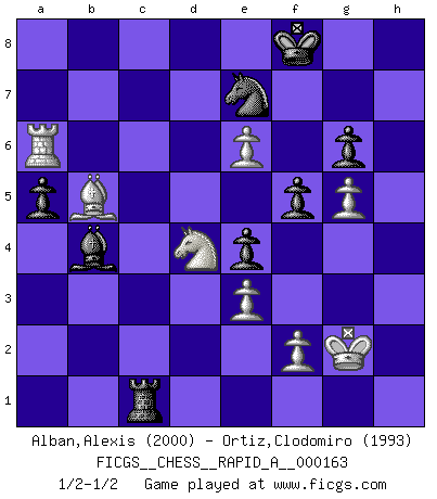 Last move : 1/2-1/2 2014 July 31 3:3:17 [Event "FICGS__CHESS__RAPID_A__000163"] [Site "FICGS"] [Date "2014.07.17"] [Round "1"] [White "Alban,Alexis"] [Black "Ortiz,Clodomiro"] [Result "1/2-1/2"] [WhiteElo "2000"] [BlackElo "1993"] 1.d4 f5 2.g3 Nf6 3.Bg2 d6 4.Nf3 g6 5.b4 Bg7 6.c4 c5 7.O-O cxb4 8.a3 bxa3 9.Nc3 Nc6 10.Bxa3 O-O 11.e3 Bd7 12.Qb1 b6 13.Rd1 Kh8 14.Qa2 Rb8 15.Rab1 Qe8 16.d5 Na5 17.c5 dxc5 18.Bxc5 bxc5 19.Qxa5 e5 20.Qxc5 e4 21.Nd4 Rc8 22.Qa5 Qe7 23.Nce2 Qc5 24.Qxc5 Rxc5 25.Ne6 Bxe6 26.dxe6 Rc7 27.Bf1 Rfc8 28.Nd4 Bf8 29.Ba6 Re8 30.Rb5 Ba3 31.Rdb1 R8e7 32.Bb7 Rc1+ 33.Rxc1 Bxc1 34.h3 Bd2 35.Ba6 Kg7 36.Rb8 Rc7 37.Kg2 Ng8 38.g4 Ne7 39.g5 h6 40.h4 hxg5 41.hxg5 Ba5 42.Bb5 Bb4 43.Ba4 a5 44.Ra8 Rc4 45.Bb5 Rc1 46.Ra7 Kf8 47.Ra6 Kg7 48.Ra7 Kf8 49.Ra6 1/2-1/2 Dutch defense Kingside Castling by player White (move 7) Kingside Castling by player Black (move 10) This chess game ended in a draw. Follow this game move after move (download)I know people who have all the will in the world, but still can't play good Chess. (Bobby Fischer) Die Elozahlen sind sehr schlecht für das Schach. Jetzt ist Schach eine Sportindustrie, die darauf zielt Elopunkte zu machen. (Miguel Najdorf) El Ajedrez es el juego mas altamente simbólico, pero las agresiones estan por lo tanto aún mas francamente representadas en la partida. Tal vez comenzo como un juego de guerra; Algo como la representación de una batalla en miniatura entre las fuerzas de dos reinos. (Karl Meninger) Votre prénom est 'Tactique', votre deuxième prénom est 'Tactique' et votre nom est 'Tactique'. (Ken Smith) Art is the only way to run away without leaving home. (Twyla Tharp)