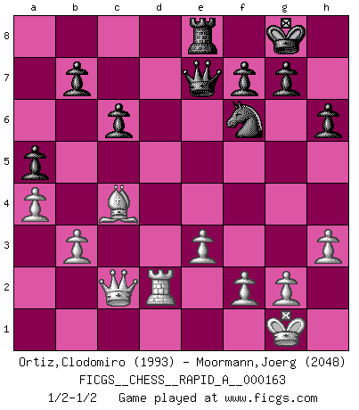 Last move : 1/2-1/2 2014 September 10 20:24:42 [Event "FICGS__CHESS__RAPID_A__000163"] [Site "FICGS"] [Date "2014.07.17"] [Round "1"] [White "Ortiz,Clodomiro"] [Black "Moormann,Joerg"] [Result "1/2-1/2"] [WhiteElo "1993"] [BlackElo "2048"] 1.d4 d5 2.c4 e6 3.Nf3 c6 4.e3 Nf6 5.Bd3 Nbd7 6.O-O dxc4 7.Bxc4 Bd6 8.b3 e5 9.Qc2 exd4 10.Nxd4 O-O 11.Bb2 Nb6 12.Bd3 Nbd5 13.a3 Re8 14.Nf3 Bg4 15.Nbd2 Bc7 16.Rfe1 a5 17.h3 Bxf3 18.Nxf3 Qe7 19.Ng5 h6 20.Nf3 Ne4 21.Rad1 Ndf6 22.Nd2 Nxd2 23.Rxd2 Be5 24.Bxe5 Qxe5 25.Red1 Qe7 26.a4 Rad8 27.Bc4 Rxd2 28.Rxd2 Qe4 29.Qa2 Qe7 30.Qc2 Qe4 31.Qa2 Qe7 32.Qc2 1/2-1/2 Queen's gambit declined Kingside Castling by player White (move 6) Kingside Castling by player Black (move 10) This chess game ended in a draw. Follow this game move after move (download)Pawn endings are to Chess what putting is to golf. (Cecil Purdy) Zeige mir drei Eröffnungsvarianten und ich beweise dir, dass zwei davon inkorrekt sind. (Emanuel Lasker) Jugadores de primera clase pierden en contra de jugadores de segunda clase porque los jugadores de segunda clase a veces juegan una partida de primer clase. (Siegbert Tarrasch) Des combinaisons [dans le jeu d'échecs] pareilles à des mélodies. Je crois entendre pour ainsi dire la musique des coups... (Vladimir Nabokov) The faster the computer, the slower the brain. (Thibault de Vassal)