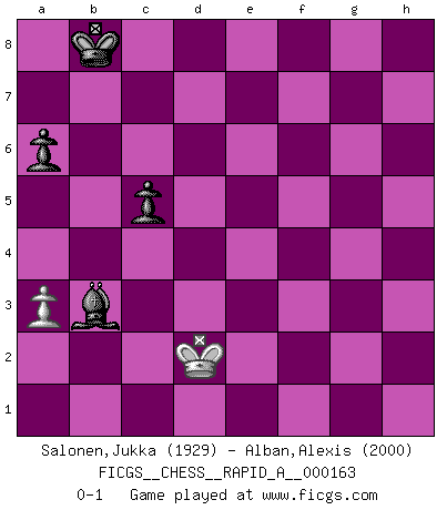 Last move : 0-1 2014 September 29 11:55:32 [Event "FICGS__CHESS__RAPID_A__000163"] [Site "FICGS"] [Date "2014.07.17"] [Round "1"] [White "Salonen,Jukka"] [Black "Alban,Alexis"] [Result "0-1"] [WhiteElo "1929"] [BlackElo "2000"] 1.d4 Nf6 2.c4 e6 3.Nf3 b6 4.Nc3 Bb4 5.Bg5 Bb7 6.e3 h6 7.Bh4 g5 8.Bg3 Ne4 9.Qc2 f5 10.Bd3 h5 11.h4 g4 12.Ng5 Nxg5 13.hxg5 Qxg5 14.Be5 Rh7 15.d5 Na6 16.O-O-O O-O-O 17.a3 Bxc3 18.Qxc3 Qg6 19.b4 d6 20.Bg3 Nb8 21.Qc2 Rf8 22.e4 h4 23.exf5 exf5 24.Bxh4 Rxh4 25.Bxf5+ Rxf5 26.Rxh4 Qg5+ 27.Kb1 Rf8 28.Rdh1 Nd7 29.Qe4 Ne5 30.f4 gxf3 31.gxf3 Kb8 32.Rh8 Qf6 33.Rxf8+ Qxf8 34.f4 Bc8 35.Ka2 Ng4 36.Re1 Nf6 37.Qe2 Bd7 38.Rg1 Qh6 39.Qf3 b5 40.cxb5 Bxb5 41.Kb3 Qh7 42.f5 Nd7 43.Rh1 Qf7 44.Rd1 Nb6 45.Rd4 Bc6 46.Kb2 Bxd5 47.Qd3 Bc4 48.Qh3 Qe8 49.Qf3 Qe1 50.Kc2 Ba2 51.Rd1 Qe5 52.Qc3 Qxf5+ 53.Qd3 Qf2+ 54.Qd2 Qf7 55.Kc1 Bb3 56.Re1 Nc4 57.Qg5 Ne5 58.Qd2 Nf3 59.Qe2 Nxe1 60.Qxe1 Qc4+ 61.Kd2 Qd4+ 62.Ke2 Qe4+ 63.Kd2 Qxe1+ 64.Kxe1 a6 65.Kd2 c5 66.bxc5 dxc5 0-1 Queen's Indian : 4.Nc3 Queenside Castling by player White (move 16) Queenside Castling by player Black (move 16) 10 pieces endgame at move 60 : White KQPP , Black KQBPPP WHITE : King + 1 Queen 2 Pawns BLACK : King + 1 Queen 1 Bishop 3 Pawns 9 pieces endgame at move 63 : White KPP , Black KQBPPP WHITE : King + 2 Pawns BLACK : King + 1 Queen 1 Bishop 3 Pawns 8 pieces endgame at move 64 : White KPP , Black KBPPP WHITE : King + 2 Pawns BLACK : King + 1 Bishop 3 Pawns 7 pieces endgame at move 66 : White KPP , Black KBPP WHITE : King + 2 Pawns BLACK : King + 1 Bishop 2 Pawns 6 pieces endgame at move 66 : White KP , Black KBPP WHITE : King + 1 Pawn BLACK : King + 1 Bishop 2 Pawns Player Black won this chess game. Follow this game move after move (download)When you don't know what to do, wait for your opponent to get an idea - it's sure to be wrong. (Tarrasch) Rauchen ist dem Schachspieler bei seiner Arbeit, also im Wettkampf, untersagt. (Viktor Kortschnoi) Yo no le temo a Spassky. Todos saben que yo soy el mejor. Uno no necesita un torneo para probarlo. (Bobby Fischer) La victoire dans une partie d'Echecs appartient la plupart du temps à celui qui voit un peu plus loin que l'adversaire. (Lasker) Patience, use the Force, think ! (Obi-Wan Kenobi in Star Wars ep.2)