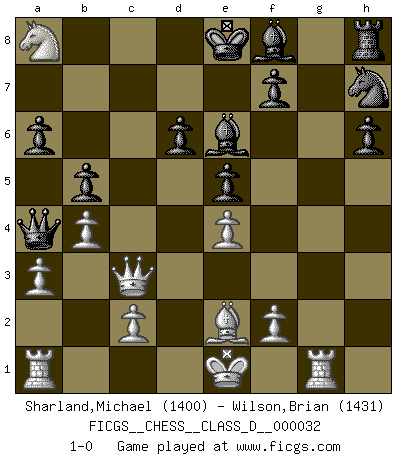 Last move : 1-0 2007 March 3 6:34:51 [Event "FICGS__CHESS__CLASS_D__000032"] [Site "FICGS"] [Date "2007.02.19"] [Round "1"] [White "Sharland,Michael"] [Black "Wilson,Brian"] [Result "1-0"] [WhiteElo "1400"] [BlackElo "1431"] 1.e4 c5 2.Nf3 d6 3.d4 cxd4 4.Nxd4 Nf6 5.Nc3 e6 6.g4 h6 7.h4 Nc6 8.Rg1 h5 9.gxh5 Nxh5 10.Bg5 Qb6 11.Nb3 a6 12.Be2 Nf6 13.h5 Qc7 14.h6 b5 15.a3 Nh7 16.Be3 gxh6 17.Bd4 Nxd4 18.Qxd4 e5 19.Nd5 Qc6 20.Qe3 Be6 21.Na5 Qd7 22.Nb6 Qc7 23.Nxa8 Qxa5+ 24.b4 Qa4 25.Qc3 1-0 Sicilian : Scheveningen, Keres attack Player White won this chess game. Follow this game move after move (download)Fischer was a master of clarity and a king of artful positioning. His opponents would see where he was going but were powerless to stop him. (Bruce Pandolfini) Bis jetzt ist Weiß einer wohlbekannten Analyse gefolgt. Aber jetzt begeht er einen schrecklichen Fehler: Er beginnt seinen eigenen Kopf zu benutzen. (Siegbert Tarrasch) El Ajedrez es un regaderazo frío para la mente. (Sir John Simon) Toutes choses étant égales, c'est la conviction qui gagne. Alliée à une volonté de vaincre, elle sert de détonateur, suscite des idées, disperse les doutes et aide à penser clairement. (Robert Fischer) Knowledge rests not upon truth alone, but upon error also. (Carl G. Jung)