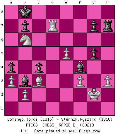 Last move : 1-0 2014 October 6 22:30:28 [Event "FICGS__CHESS__RAPID_B__000218"] [Site "FICGS"] [Date "2014.07.17"] [Round "1"] [White "Domingo,Jordi"] [Black "Sternik,Ryszard"] [Result "1-0"] [WhiteElo "1816"] [BlackElo "1816"] 1.g4 d5 2.Bg2 e5 3.c4 dxc4 4.Nc3 Ne7 5.Qa4+ Nbc6 6.Qxc4 Qd4 7.Qxd4 Nxd4 8.Rb1 c6 9.h3 Ng6 10.Be4 h5 11.Bxg6 fxg6 12.gxh5 Bf5 13.d3 Rxh5 14.Be3 O-O-O 15.Rc1 g5 16.Kf1 Be7 17.Kg2 Rdh8 18.f3 a6 19.Ne4 Be6 20.a3 Bd5 21.Bf2 a5 22.e3 Nb3 23.Rc3 a4 24.Bg3 Bf6 25.Rc2 Be6 26.Nf2 Rd8 27.Ne2 Be7 28.Nc1 Na1 29.Re2 Bd6 30.Ng4 e4 31.dxe4 Be7 32.Be5 Rh7 33.Rf2 Bf7 34.Bc3 Be6 35.Rd2 Rxd2+ 36.Bxd2 Nc2 37.Nd3 c5 38.Rc1 Bb3 39.Nde5 Bd6 40.Ng6 c4 41.Bc3 Bc5 42.Rd1 Nxe3+ 43.Nxe3 Bxe3 44.Ne7+ Kb8 45.Rd7 Bf4 46.Nd5 Kc8 47.Nb6+ Kb8 48.e5 1-0 Grob's attack Queenside Castling by player Black (move 14) Player White won this chess game. Follow this game move after move (download)A Chess game is divided into three stages: the first, when you hope you have the advantage, the second when you believe you have an advantage, and the third... when you know you're going to lose ! (Savielly Tartakower) Im Schach gewinnt jeder. Hat man Freunde am Spiel - und das ist die Hauptsache - ist auch der Verlust einer Partie kein Unglück. (David Bronstein) En manos de Fischer's, una diminuta ventaja teórica es tan buena como tener una Reina de ventaja. (Isaac Kashdan) La guerre est enfant de la passion, la passion est enfant du narcissisme et le narcissisme est l'enfant. (...) Une autre partie ? (Thibault de Vassal) Perception is reality. (Immanuel Kant)