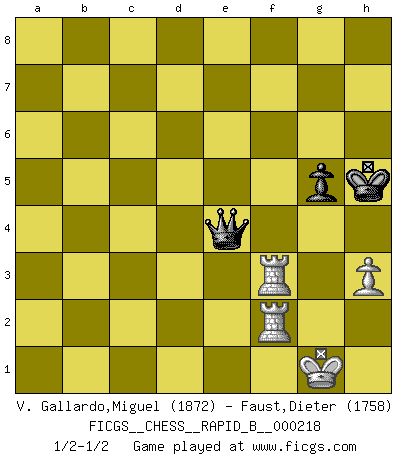 Last move : 1/2-1/2 2014 October 30 15:5:51 [Event "FICGS__CHESS__RAPID_B__000218"] [Site "FICGS"] [Date "2014.07.17"] [Round "1"] [White "V. Gallardo,Miguel"] [Black "Faust,Dieter"] [Result "1/2-1/2"] [WhiteElo "1872"] [BlackElo "1758"] 1.e4 d6 2.d4 Nf6 3.Nc3 g6 4.Bg5 c6 5.Qd2 h6 6.Bh4 Bg7 7.f4 O-O 8.Nf3 Na6 9.Bxa6 bxa6 10.O-O Rb8 11.b3 Be6 12.f5 gxf5 13.Bxf6 exf6 14.Nh4 fxe4 15.Nxe4 Rb5 16.a4 Rh5 17.Nf3 c5 18.Ng3 Rd5 19.c4 Rg5 20.Nxg5 fxg5 21.Ne2 cxd4 22.Nxd4 Qb6 23.Rad1 Bg4 24.a5 Qc5 25.b4 Qxc4 26.Nf3 Rc8 27.h3 Bxf3 28.Rxf3 Be5 29.Kh1 Rc7 30.Rdf1 d5 31.Qe3 Qe4 32.Qf2 Bf4 33.Rd1 Qxb4 34.g3 Be5 35.Rxd5 Qe4 36.R5d3 f5 37.Rde3 Rc1+ 38.Kh2 Qc4 39.Rxe5 Rc2 40.R3xf5 Rxf2+ 41.Rxf2 Qd4 42.Rfe2 Qc4 43.R5e4 Qb5 44.Rc2 Qxa5 45.Re7 Qf5 46.Rd2 Qc8 47.Rxa7 h5 48.Ra2 h4 49.R7xa6 hxg3+ 50.Kxg3 Qc7+ 51.Kg2 Qb7+ 52.Kf2 Qf7+ 53.Kg1 Qb3 54.R6a3 Qb1+ 55.Kh2 Qe1 56.Rg3 Qe5 57.Rd2 Kg7 58.Kg2 Qe4+ 59.Rf3 Kg6 60.Rdf2 Kh5 61.Kg1 1/2-1/2 Pirc : Byrne variation Kingside Castling by player Black (move 7) Kingside Castling by player White (move 10) 10 pieces endgame at move 47 : White KRRPP , Black KQPPP WHITE : King + 2 Rooks 2 Pawns BLACK : King + 1 Queen 3 Pawns 9 pieces endgame at move 49 : White KRRPP , Black KQPP WHITE : King + 2 Rooks 2 Pawns BLACK : King + 1 Queen 2 Pawns 8 pieces endgame at move 49 : White KRRP , Black KQPP WHITE : King + 2 Rooks 1 Pawn BLACK : King + 1 Queen 2 Pawns 7 pieces endgame at move 50 : White KRRP , Black KQP WHITE : King + 2 Rooks 1 Pawn BLACK : King + 1 Queen 1 Pawn This chess game ended in a draw. Follow this game move after move (download)It began to feel as though you were playing against Chess itself. - On playing against Robert Fischer. (Walter Shipman) Man wirke der falschen Auffassung entgegen, als ob jeder Zug Unmittelbares zu leisten habe; auch Werte- und Ruhezüge haben ihre Existenzberechtigung. (Aaron Nimzowitsch) Yo he agregado estos principios a la ley: pongan los Caballos en acción antes de que los dos Alfiles sean desarrollados. (Emanuel Lasker) Le système Elo représente seulement une moyenne. Il est simplement un indicateur de votre stabilité. (Anatoli Karpov) If everyone is thinking alike, then somebody isn't thinking. (US General George S. Patton)