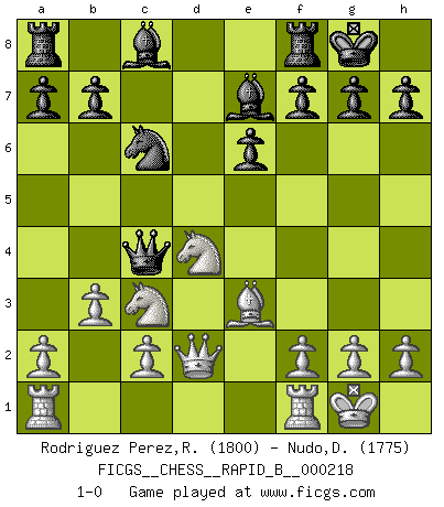 Last move : 1-0 2014 August 29 18:2:39 [Event "FICGS__CHESS__RAPID_B__000218"] [Site "FICGS"] [Date "2014.07.17"] [Round "1"] [White "Rodriguez Perez,Rene"] [Black "Nudo,Davide"] [Result "1-0"] [WhiteElo "1800"] [BlackElo "1775"] 1.e4 e6 2.d4 d5 3.Bd3 dxe4 4.Bxe4 Nf6 5.Bf3 c5 6.Ne2 Nc6 7.Be3 Nd5 8.Bxd5 Qxd5 9.O-O cxd4 10.Nxd4 Be7 11.Nc3 Qc4 12.Qd2 O-O 13.b3 1-0 This chess game has been lost on time (started : 2014.07.17 23:35:1) French : Schlechter variation Kingside Castling by player White (move 9) Kingside Castling by player Black (move 12) Player White won this chess game. Follow this game move after move (download)If one piece is badly posted, the whole game is bad. (Tarrasch) Frage: Was machen Sie mit den Preisen? Anwort: Ich habe Angst, dass meine Freundin davon neue Kleider kauft. (Loek van Wely) Después de una mala apertura, hay una esperanza en el juego medio. Pero una vez que estas en finales, el momento de la verdad ha llegado. (Edmar Mednis) Vouloir jouer aux échecs contre soi-même est aussi paradoxal que vouloir marcher sur son ombre. (Stefan Zweig) The meaning of life is that it is to be lived, and it is not to be traded and conceptualized and squeezed into a pattern of systems. (Bruce Lee)
