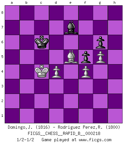 Last move : 1/2-1/2 2014 September 21 23:3:29 [Event "FICGS__CHESS__RAPID_B__000218"] [Site "FICGS"] [Date "2014.07.17"] [Round "1"] [White "Domingo,Jordi"] [Black "Rodriguez Perez,Rene"] [Result "1/2-1/2"] [WhiteElo "1816"] [BlackElo "1800"] 1.g4 d5 2.Bg2 Nc6 3.c4 dxc4 4.Qa4 Qd6 5.Na3 Qc5 6.h3 Be6 7.Nb5 Rc8 8.b4 cxb3 9.Nd4 Bd5 10.Bxd5 Qxd5 11.Ngf3 bxa2 12.Nxc6 Qxc6 13.Qxc6+ bxc6 14.Rxa2 Ra8 15.Bb2 Nf6 16.O-O Nd5 17.Rfa1 f6 18.Rxa7 Rxa7 19.Rxa7 Kd7 20.Ra8 c5 21.Kf1 Nb6 22.Rb8 g6 23.Ng5 Nc4 24.Nf7 Rg8 25.Bc1 Nd6 26.Nxd6 exd6 27.Bb2 f5 28.g5 c4 29.Bf6 d5 30.f4 Ke6 31.Rc8 h6 32.h4 c5 33.e3 Kf7 34.Rd8 hxg5 35.hxg5 d4 36.Ke2 Bg7 37.Rd7+ Kf8 38.Rc7 Bh8 39.Be7+ Kf7 40.Bxc5 Ke6 41.Bb4 Rb8 42.Rxc4 dxe3 43.Kxe3 Bb2 44.Rc6+ Kd5 45.Rc5+ Ke6 46.Bc3 Kd6 47.Kd4 Rb4+ 48.Rc4 Rxc4+ 49.Kxc4 Ba3 50.Bg7 Kc6 51.Be5 Be7 52.d4 1/2-1/2 Grob's attack Kingside Castling by player White (move 16) 10 pieces endgame at move 48 : White KBPPP , Black KRBPP WHITE : King + 1 Bishop 3 Pawns BLACK : King + 1 Rook 1 Bishop 2 Pawns 9 pieces endgame at move 49 : White KBPPP , Black KBPP WHITE : King + 1 Bishop 3 Pawns BLACK : King + 1 Bishop 2 Pawns This chess game ended in a draw. Follow this game move after move (download)In Chess, at least, the brave inherit the earth. (Edmar Mednis) Du musst nicht gut spielen, es reicht, wenn du besser spielst als dein Gegner. (Anonymous) Vive, pierde y aprende al observar a tu oponente como gana. (Amber Steenbock) Les sacrifices démontrent seulement que quelqu'un a gaffé. (Savielly Tartacover) The smarter you play, the luckier you'll be. (Mark Pilarski)