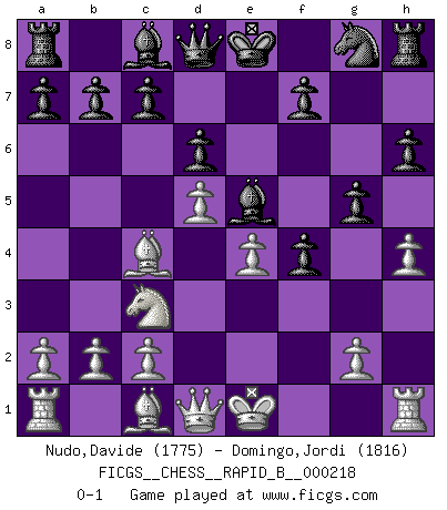 Last move : 0-1 2014 August 27 17:58:54 [Event "FICGS__CHESS__RAPID_B__000218"] [Site "FICGS"] [Date "2014.07.17"] [Round "1"] [White "Nudo,Davide"] [Black "Domingo,Jordi"] [Result "0-1"] [WhiteElo "1775"] [BlackElo "1816"] 1.e4 e5 2.f4 exf4 3.Nf3 d6 4.Bc4 h6 5.d4 g5 6.Nc3 Bg7 7.h4 Nc6 8.d5 Ne5 9.Nxe5 Bxe5 0-1 This chess game has been lost on time (started : 2014.07.17 23:35:1) KGA : Fischer defense Player Black won this chess game. Follow this game move after move (download)Chess is so inspiring that I do not believe a good player is capable of having an evil thought during the game. (Wilhelm Steinitz) Der Knackpunkt bei der Konzentration ist, daß wir nur durch sie etwas Neues und Ungewöhnliches am Schachbrett finden können. Sie ist der einzige Weg durch neue neue Ideen eine Überraschung zu bereiten. (Garry Kasparov) El Ajedrez moderno está demasiado preocupado con cosas como la estructura de Peones. Olvidenlo, el Jaque Mate termina la partida. (Nigel Short) Karpov est une pièce de musée. (Garry Kasparov) The only thing that overcomes hard luck is hard work. (Harry Golden)