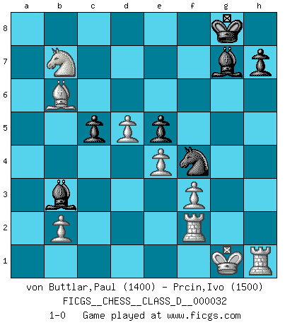 Last move : 1-0 2007 May 23 11:2:53 [Event "FICGS__CHESS__CLASS_D__000032"] [Site "FICGS"] [Date "2007.02.19"] [Round "1"] [White "von Buttlar,Paul"] [Black "Prcin,Ivo"] [Result "1-0"] [WhiteElo "1400"] [BlackElo "1500"] 1.c4 Nf6 2.Nc3 g6 3.e4 d6 4.d4 Bg7 5.f3 O-O 6.Be3 e5 7.d5 c6 8.Bd3 c5 9.Nge2 a6 10.Qd2 Re8 11.O-O Nbd7 12.g4 Rb8 13.Ng3 Re7 14.g5 Ne8 15.h4 f6 16.Rf2 Nf8 17.Raf1 Bh3 18.Rb1 Rf7 19.Kh2 Bc8 20.Rh1 Qd7 21.Kg1 Nc7 22.a4 b5 23.axb5 axb5 24.h5 bxc4 25.Bxc4 fxg5 26.Bxg5 Ba6 27.Ba2 Nb5 28.Nxb5 Rxb5 29.hxg6 Nxg6 30.Bc4 Rb6 31.Qa5 Qb7 32.Bd8 Bxc4 33.Qxb6 Qxb6 34.Bxb6 Nf4 35.Nf5 Bb3 36.Nxd6 Rb7 37.Nxb7 1-0 English Opening Kingside Castling by player Black (move 5) Kingside Castling by player White (move 11) Player White won this chess game. Follow this game move after move (download)Chess is so inspiring that I do not believe a good player is capable of having an evil thought during the game. (Wilhelm Steinitz) Es hat in meinem Leben Zeiten gegeben, in denen das Schachspiel, wenn nicht zum Lebenszweck, so doch zu einem regelrechten Lebensersatz geworden ist. Man fühlt sich in solchen Zeiten nicht so, als besäße man eine göttliche Gabe, sondern eher so, als sei man von ihr besessen. (Garry Kasparov) ¡Examina movidas que hagan daño! Un buen ojo for movidas desvastantes es mucho mas importante que el conocimiento de principios estratégicos. (Purdy) Si rien de grave n'est détecté lors de l'analyse d'une position, on joue alors le coup. Seconde règle de Blumenfeld. There are two kinds of tragedy in this world, one is not getting what you want and the other is getting. (Lord of war)