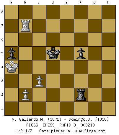 Last move : 1/2-1/2 2014 November 7 18:23:42 [Event "FICGS__CHESS__RAPID_B__000218"] [Site "FICGS"] [Date "2014.07.17"] [Round "1"] [White "V. Gallardo,Miguel"] [Black "Domingo,Jordi"] [Result "1/2-1/2"] [WhiteElo "1872"] [BlackElo "1816"] 1.e4 e5 2.Nf3 d6 3.d4 exd4 4.Nxd4 g6 5.Nc3 Bg7 6.Be3 Nf6 7.f3 O-O 8.Qd2 d5 9.O-O-O dxe4 10.Ndb5 Qxd2+ 11.Rxd2 Na6 12.fxe4 Re8 13.Bf4 Nh5 14.Nxc7 Nxc7 15.Bxc7 Bh6 16.Bb5 Bd7 17.Bxd7 Re7 18.Bb5 Rxc7 19.Nd5 Rc5 20.Be2 Kg7 21.Bxh5 gxh5 22.Rf1 Re8 23.Nf4 Rxe4 24.g3 Rf5 25.Rdf2 h4 26.c3 hxg3 27.hxg3 b5 28.Rg2 Kf6 29.Rh2 Bxf4+ 30.Rxf4 Rexf4 31.gxf4 Kg6 32.Rg2+ Kh5 33.Rh2+ Kg4 34.Rxh7 Kxf4 35.Kc2 Ke3 36.Rh3+ Rf3 37.Rh7 a5 38.Kb3 f5 39.Re7+ Kd3 40.a4 bxa4+ 41.Kxa4 Rf2 42.Rd7+ Kc4 43.Rc7+ Kd5 44.Rb7 1/2-1/2 Philidor : Larsen variation Kingside Castling by player Black (move 7) Queenside Castling by player White (move 9) 10 pieces endgame at move 34 : White KRPPP , Black KRPPP WHITE : King + 1 Rook 3 Pawns BLACK : King + 1 Rook 3 Pawns 9 pieces endgame at move 40 : White KRPP , Black KRPPP WHITE : King + 1 Rook 2 Pawns BLACK : King + 1 Rook 3 Pawns 8 pieces endgame at move 41 : White KRPP , Black KRPP WHITE : King + 1 Rook 2 Pawns BLACK : King + 1 Rook 2 Pawns This chess game ended in a draw. Follow this game move after move (download)The older I grow, the more I value Pawns. (Keres) Die Jungen erwarten, dass Opa einfach umfällt. Dann aber kann Opa fünf Stunden lang Schach spielen und die jungen Gegner an die Wand drücken. (Viktor Kortschnoi) El jugador de combinación piensa hacia adelante; comienza de la posición dada y trabaja las movidas contundentes en su mente. (Emanuel Lasker) Vous n'êtes pas toujours obligé de jouer le meilleur coup. Un coup doit être actif, entreprenant, correct et beau ! (David Bronstein) Philosophers use a language that is already deformed as though by shoes that are too tight. (Ludwig Wittgenstein)