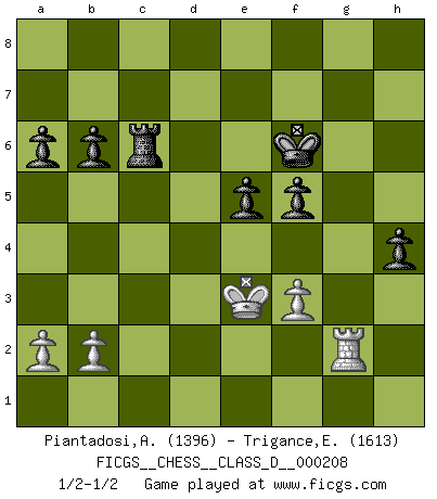 Last move : 1/2-1/2 2014 November 3 7:2:25 [Event "FICGS__CHESS__CLASS_D__000208"] [Site "FICGS"] [Date "2014.07.18"] [Round "1"] [White "Piantadosi,Angelo"] [Black "Trigance,Emile"] [Result "1/2-1/2"] [WhiteElo "1396"] [BlackElo "1613"] 1.e4 c5 2.c3 d5 3.exd5 Qxd5 4.d4 cxd4 5.cxd4 Nc6 6.Nf3 Bg4 7.Be2 e6 8.Nc3 Qa5 9.O-O Nf6 10.Re1 Be7 11.Ne5 Bxe2 12.Rxe2 Nxe5 13.dxe5 Nd7 14.Bd2 Qd8 15.Rc1 a6 16.Qa4 O-O 17.Ne4 Rc8 18.Nd6 Rxc1+ 19.Bxc1 Nb6 20.Qe4 Bxd6 21.exd6 Qxd6 22.g3 h6 23.Kg2 Rc8 24.Bf4 Qd5 25.Qxd5 Nxd5 26.Kf3 Nxf4 27.gxf4 Kf8 28.Ke4 Rc5 29.Rd2 Ke7 30.Ke3 b6 31.Ke4 f6 32.Kf3 g5 33.fxg5 hxg5 34.Ke3 f5 35.f3 Rc6 36.Rg2 Kf6 37.h3 e5 38.h4 gxh4 39.Rh2 Kg5 40.Rg2+ Kf6 41.Rh2 Kg5 42.Rg2+ Kf6 1/2-1/2 Sicilian : Alapin's variation (2.c3) Kingside Castling by player White (move 9) Kingside Castling by player Black (move 16) This chess game ended in a draw. Follow this game move after move (download)Chess is no whit inferior to the violin, and we have a large number of professional violinists. (Mikhail Botvinnik) Wenn sie aufgeben, dann danke ich Ihnen für das Spiel (Eventualzug beim Fernschach). (Anonymous) La pasion por jugar al Ajedrez es una de las mas inexplicables en el mundo. (H.G. Wells) On peut tirer plus d'utilité d'une partie perdue que de 100 parties gagnées. (Capablanca) Hardware: the parts of a computer that can be kicked. (Jeff Persis)