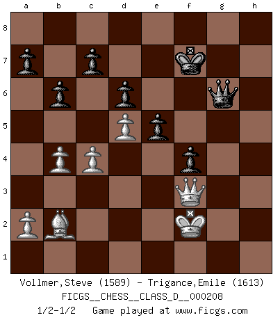 Last move : 1/2-1/2 2014 September 7 19:48:54 [Event "FICGS__CHESS__CLASS_D__000208"] [Site "FICGS"] [Date "2014.07.18"] [Round "1"] [White "Vollmer,Steve"] [Black "Trigance,Emile"] [Result "1/2-1/2"] [WhiteElo "1589"] [BlackElo "1613"] 1.d4 Nf6 2.c4 e6 3.Nf3 b6 4.Nc3 Bb4 5.e3 Bb7 6.Bd2 O-O 7.Bd3 Bxc3 8.Bxc3 Ne4 9.Rc1 f5 10.O-O d6 11.Qe2 Nd7 12.b4 Ndf6 13.Bb2 Qe8 14.Bc2 Qh5 15.Rfe1 g5 16.d5 e5 17.Bxe4 Nxe4 18.Nd2 Qh4 19.Nf3 Qh6 20.Nd2 Nxd2 21.Qxd2 f4 22.f3 Bc8 23.exf4 Rxf4 24.Re4 Qg6 25.Rxf4 gxf4 26.Qf2 Bd7 27.Re1 Kf7 28.g4 h5 29.h3 hxg4 30.fxg4 Rg8 31.Qf3 Qh5 32.Re2 Bxg4 33.hxg4 Rxg4+ 34.Rg2 Rxg2+ 35.Kxg2 Qg6+ 36.Kf2 Qc2+ 37.Qe2 Qg6 38.Qf3 Qc2+ 39.Qe2 Qg6 40.Qf3 1/2-1/2 Queen's Indian : 4.Nc3 Kingside Castling by player Black (move 6) Kingside Castling by player White (move 10) This chess game ended in a draw. Follow this game move after move (download)I love all positions. Give me a difficult positional game, I will play it. But totally won positions, I cannot stand them. (Hein Donner) Irgendwie scheint mir sonntags früh um 9 Uhr der Killerinstinkt verloren gegangen zu sein. (Alexej Shirov) Cuando tengo las piezas blancas, yo gano porque soy blanco; Cuando tengo las piezas negras, yo gano porque soy Bogolyubov. (Bogolyubov) Il vaut toujours mieux jouer un plan faux de façon logique que de n'avoir pas de plan du tout. (Victor Kortchnoï) When it is a question of money, everybody is of the same religion. (Voltaire)