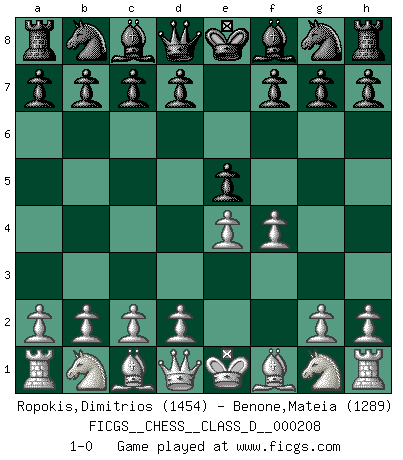 Last move : 1-0 2014 August 28 6:1:44 [Event "FICGS__CHESS__CLASS_D__000208"] [Site "FICGS"] [Date "2014.07.18"] [Round "1"] [White "Ropokis,Dimitrios"] [Black "Benone,Mateia"] [Result "1-0"] [WhiteElo "1454"] [BlackElo "1289"] 1.e4 e5 2.f4 1-0 This chess game has been lost on time (started : 2014.07.18 1:12:59) King's gambit Player White won this chess game. Follow this game move after move (download)By this measure (on the gap between Fischer & his contemporaries), I consider him the greatest world champion. (Garry Kasparov) Ohne Leiden bildet sich kein Charakter. (Ernst Freiherr von Feuchtersleben) Yo siempre he tenido un ligero sentimiento de lástima por una persona que no tiene conocimiento del Ajedrez. (Siegbert Tarrasch) Je crois qu'il existe des manières très spécifiques de jouer efficacement contre une machine. Evidemment, nous n'avons aucune chance en technique pure, parce que l'ordinateur calcule de manière parfaite. Mais lorsque nous faisons appel à notre cerveau, en utilisant l'intuition et la compréhension, alors nous restons beaucoup plus forts. (Anatoli Karpov) History is the quarrels of popes and kings, with wars or pestilences in every page; the men all so good for nothing, and hardly any women at all. (Jane Austen)