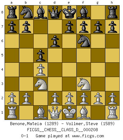 Last move : 0-1 2014 August 27 5:55:42 [Event "FICGS__CHESS__CLASS_D__000208"] [Site "FICGS"] [Date "2014.07.18"] [Round "1"] [White "Benone,Mateia"] [Black "Vollmer,Steve"] [Result "0-1"] [WhiteElo "1289"] [BlackElo "1589"] 1.Nf3 Nf6 2.c4 c5 3.Nc3 d6 0-1 This chess game has been lost on time (started : 2014.07.18 1:12:59) Reti Opening Player Black won this chess game. Follow this game move after move (download)No one ever won a game by resigning. (Unknown) Der Schachmeister von Heute braucht Courage, einen Killerinstinkt, Ausdauer und Arroganz. (Larry Evans) El Ajedrez es un terrible juego. Si no controlas el centro, tu oponente tiene una posición mas holgada. Si tienes control del centro, ¡entonces realmente tu tienes algo de que preocuparte!. (Siegbert Tarrasch) Les sacrifices démontrent seulement que quelqu'un a gaffé. (Savielly Tartacover) I couldn't make any sense out of what this particular thread is about. It sounds like R2 D2 computer speaking. A space fight ?!? Some 'command' problems in Moscow ? Some killers & narcotic addicts attacking some game & a god wannabe ?? (Dinesh De Silva, lost in a russian conflict in FICGS forum)