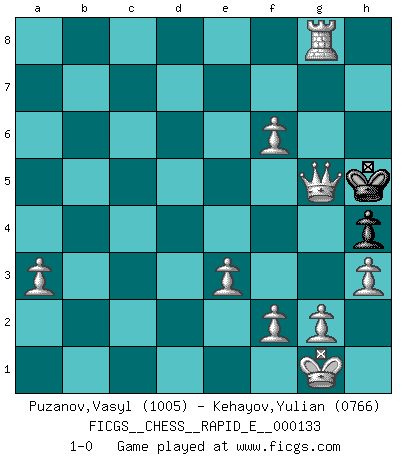 Last move : 1-0 2014 November 14 20:50:53 [Event "FICGS__CHESS__RAPID_E__000133"] [Site "FICGS"] [Date "2014.07.20"] [Round "1"] [White "Puzanov,Vasyl"] [Black "Kehayov,Yulian"] [Result "1-0"] [WhiteElo "1005"] [BlackElo "0766"] 1.d4 d5 2.Nc3 Nf6 3.Nf3 h6 4.Bf4 e6 5.e3 Be7 6.Bd3 O-O 7.O-O c5 8.h3 c4 9.Be2 Nc6 10.a3 Bd6 11.Bxd6 Qxd6 12.b3 cxb3 13.cxb3 e5 14.Nb5 Qe6 15.Nc7 Qe7 16.Nxa8 Bf5 17.dxe5 Nd7 18.Nc7 Nb6 19.Nxd5 Nxd5 20.Qxd5 Qe6 21.Qxe6 Bxe6 22.b4 a6 23.Rac1 Rc8 24.Rfd1 Kh7 25.Bd3+ Kg8 26.Be4 g6 27.Bxc6 Rxc6 28.Rxc6 bxc6 29.Rd6 Bd5 30.Nd4 h5 31.Nxc6 Bxc6 32.Rxc6 Kg7 33.Rxa6 Kf8 34.Rc6 Kg7 35.b5 Kh6 36.b6 Kg7 37.b7 Kh6 38.b8Q Kg7 39.Rc8 f6 40.Rg8+ Kh6 41.exf6 g5 42.Qc7 h4 43.Qg7+ Kh5 44.Qxg5+ 1-0 Queen's pawn : Chigorin variation Kingside Castling by player Black (move 6) Kingside Castling by player White (move 7) Promotion Queen by player White (move 38) Player White won this chess game. Follow this game move after move (download)Avoid the crowd. Do your own thinking independently. Be the Chess player, not the Chess piece. (Ralph Charell) Ein guter Spieler hat immer Glück. (José Raúl Capablanca) Me dio la sensación de como si yo estuviera jugando en contra del mismo Ajedrez. - al estar jugando en contra de Robert Fischer (Walter Shipman) Des points faibles ou des trous dans la position de l'adversaire doivent être occupés par des pièces et non pas par des pions. (Siegbert Tarrasch) They say in chess you've got to kill the queen, and then you mate it... Oh I, do you ? (Red Hot Chili Peppers, Fortune faded)