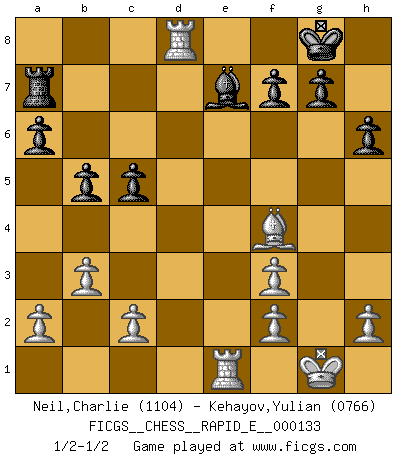 Last move : 1/2-1/2 2014 August 14 23:28:28 [Event "FICGS__CHESS__RAPID_E__000133"] [Site "FICGS"] [Date "2014.07.20"] [Round "1"] [White "Neil,Charlie"] [Black "Kehayov,Yulian"] [Result "1/2-1/2"] [WhiteElo "1104"] [BlackElo "0766"] 1.e4 e5 2.Nf3 d6 3.Nc3 Nf6 4.d4 exd4 5.Qxd4 h6 6.Bd3 c5 7.Qa4+ Nc6 8.Bb5 Bd7 9.O-O Be7 10.Re1 O-O 11.Bf4 a6 12.Bxc6 Bxc6 13.Qc4 b5 14.Qe2 Re8 15.Rad1 d5 16.exd5 Nxd5 17.Nxd5 Bxd5 18.Ne5 Ra7 19.b3 Qa8 20.Nf3 Bxf3 21.Qxf3 Qxf3 22.gxf3 Rd8 23.Rxd8+ 1/2-1/2 Philidor's defense Kingside Castling by player White (move 9) Kingside Castling by player Black (move 10) This chess game ended in a draw. Follow this game move after move (download)One bad move nullifies forty good ones. (Horowitz) Sitze auf Deine Hände. (Siegbert Tarrasch) La esencia del Ajedrez es pensar acerca de lo que el Ajedrez es. (David Bronstein) Karpov est une pièce de musée. (Garry Kasparov) How many people work in NATO Headquarters ? - About half of them. (Dirk Stikker, NATO general secretary)