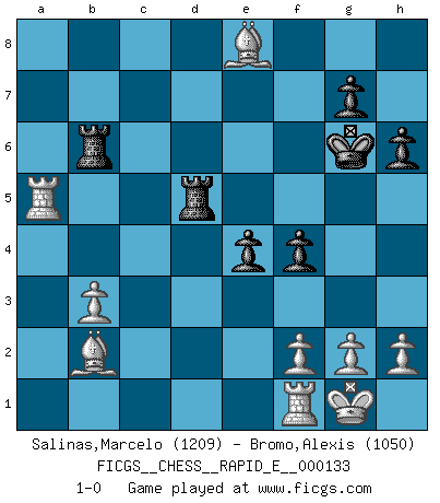 Last move : 1-0 2014 August 29 19:14:31 [Event "FICGS__CHESS__RAPID_E__000133"] [Site "FICGS"] [Date "2014.07.20"] [Round "1"] [White "Salinas,Marcelo"] [Black "Bromo,Alexis"] [Result "1-0"] [WhiteElo "1209"] [BlackElo "1050"] 1.e3 e5 2.Qf3 Nf6 3.Nc3 a6 4.Nd5 Nxd5 5.Qxd5 Nc6 6.Nf3 d6 7.d4 Be6 8.Qe4 h6 9.d5 f5 10.Qc4 Na5 11.Qa4+ Bd7 12.Qxa5 Be7 13.Qb4 b5 14.e4 f4 15.c4 a5 16.Qd2 c6 17.b3 b4 18.dxc6 Bxc6 19.c5 d5 20.Nxe5 dxe4 21.Qxd8+ Rxd8 22.Nxc6 Rd5 23.Nxe7 Kxe7 24.c6 Rc8 25.Bc4 R5d8 26.Bb5 Rd5 27.a4 bxa3 28.Bxa3+ Kf6 29.Bb2+ Kg6 30.Rxa5 Rxc6 31.O-O Rb6 32.Be8+ 1-0 Van't Kruijs Opening Kingside Castling by player White (move 31) Player White won this chess game. Follow this game move after move (download)Pawn endings are to Chess what putting is to golf. (Cecil Purdy) Sicherlich können nur Meister einen Stil haben. Daß ein nicht-Meister auch nur ein einziges Mal in seinem Leben eine Partie folgerecht durchführte, habe ich niemals bemerkt. (Emanuel Lasker) Un entendimiento a fondo de las continuaciones típicas del mate, hace de las combinaciones de sacrificio mas complicadas conducirlas a ellas no solo sin dificultad, sino casi de una manera natural. (Siegbert Tarrasch) Un footballeur joue avec ses pieds, parfois avec sa tête. Un joueur d'échecs ne joue qu'avec sa tête. Et quand il ne joue plus, il meurt. (Jacob Murray) What doesn't kill us makes us stronger. (Friedrich Nietzsche)
