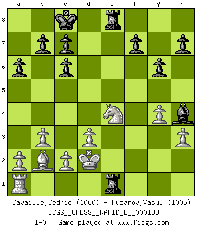 Last move : 1-0 2014 October 11 0:11:59 [Event "FICGS__CHESS__RAPID_E__000133"] [Site "FICGS"] [Date "2014.07.20"] [Round "1"] [White "Cavaille,Cedric"] [Black "Puzanov,Vasyl"] [Result "1-0"] [WhiteElo "1060"] [BlackElo "1005"] 1.e4 e5 2.Nf3 Nc6 3.Bb5 a6 4.Bxc6 dxc6 5.Nxe5 Qd4 6.Nd3 Qxe4+ 7.Qe2 Qxe2+ 8.Kxe2 Nf6 9.h3 Bf5 10.g4 Bxd3+ 11.Kxd3 O-O-O 12.Ke2 Re8+ 13.Kd1 Ne4 14.Rf1 Bc5 15.Nc3 Nxf2+ 16.Rxf2 Bxf2 17.d3 Re1+ 18.Kd2 Rhe8 19.Ne4 Bh4 20.b3 g6 21.Bb2 1-0 Ruy Lopez : Exchange variation Queenside Castling by player Black (move 11) Player White won this chess game. Follow this game move after move (download)Chess is like war on a board. (Bobby Fischer) Es gibt nur zwei wahre Schachgenies - das andere war Wilhelm Steinitz, der Weltmeister von 1872 bis 1894. (Robert James Fischer) El juego del Ajedrez no es solamente una diversión quieta; algunas cualidades muy valuables de la mente se pueden adquirir y cultivar con el, como convertirlos en habitos disponibles para toda ocasión; ya que la vida es algo así como el Ajedrez. (Benjamin Franklin) Horreur, mais aussi harmonie suprême : qu'y avait-il en effet au monde en dehors des échecs ? Le brouillard, l'inconnu, le non-être... (Vladimir Nabokov) Man with more than one clock never knows what time it is. (Chinese thought)