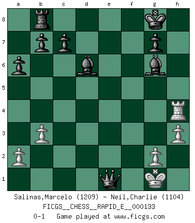 Last move : 0-1 2014 November 5 22:13:15 [Event "FICGS__CHESS__RAPID_E__000133"] [Site "FICGS"] [Date "2014.07.20"] [Round "1"] [White "Salinas,Marcelo"] [Black "Neil,Charlie"] [Result "0-1"] [WhiteElo "1209"] [BlackElo "1104"] 1.e3 e5 2.Nc3 Nf6 3.d4 exd4 4.Qxd4 Nc6 5.Qf4 Bb4 6.Bc4 O-O 7.Nf3 d5 8.Bd3 Re8 9.e4 dxe4 10.O-O exd3 11.Rd1 Bd6 12.Qd2 dxc2 13.Qxc2 a6 14.Be3 Bg4 15.Qb3 Rb8 16.Nd5 Nxd5 17.Qxd5 Be6 18.Qd3 Bg4 19.Ng5 Ne5 20.Qxh7+ Kf8 21.Rd4 Qd7 22.Nxf7 Kxf7 23.h3 Bf5 24.Qh5+ Kg8 25.Rh4 Nc4 26.Qh8+ Kf7 27.Qh5+ Bg6 28.Qd5+ Qe6 29.Qf3+ Kg8 30.b3 Nxe3 31.fxe3 Qxe3+ 32.Kh1 Qe5 33.Kg1 Qxa1+ 34.Qf1 Re1 35.Qxe1 Qxe1+ 0-1 This chess game has been lost on time (started : 2014.07.20 20:30:37) Van't Kruijs Opening Kingside Castling by player Black (move 6) Kingside Castling by player White (move 10) Player Black won this chess game. Follow this game move after move (download)It is peculiar but a fact nevertheless, that gamblers in chess always have enthusiastic followers. (Botvinnik) Ich verachte Kasparow. (Viktor Kortschnoi) El juego de Fischer siempre fue nítido, racional y brillante. Uno de los mejores por siempre. (Dave Regis) Fischer est le meilleur joueur du monde et Karpov n'est qu'un joueur de bistrot. (Garry Kasparov, agé de 16 ans) A journey of a thousand sites begins with a single click. (Author unknown)