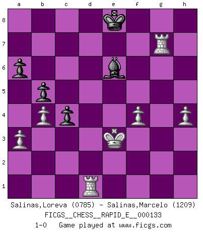 Last move : 1-0 2014 November 8 21:44:12 [Event "FICGS__CHESS__RAPID_E__000133"] [Site "FICGS"] [Date "2014.07.20"] [Round "1"] [White "Salinas,Loreva"] [Black "Salinas,Marcelo"] [Result "1-0"] [WhiteElo "0785"] [BlackElo "1209"] 1.e3 e6 2.Qf3 Nh6 3.Bb5 Bc5 4.Qg3 Nf5 5.Qe5 a6 6.Bd3 O-O 7.Bxf5 Qg5 8.Bxh7+ Kxh7 9.Qe4+ f5 10.Qf3 Rf6 11.d4 Bb6 12.Nc3 Nc6 13.e4 f4 14.e5 Nxd4 15.Qe4+ Qf5 16.exf6 Nxc2+ 17.Ke2 Kg8 18.Qxf5 exf5 19.Rb1 c6 20.fxg7 Kxg7 21.Bxf4 d5 22.Be5+ Kg6 23.a3 Bd4 24.Nf3 Bxe5 25.Nxe5+ Kf6 26.f4 Nd4+ 27.Kd3 Ne6 28.Rhf1 c5 29.Nxd5+ Kg7 30.b4 Ra7 31.Rfc1 b5 32.g4 c4+ 33.Ke3 fxg4 34.Nxg4 Nc7 35.Nxc7 Rxc7 36.Rg1 Re7+ 37.Ne5 Kf8 38.Rbd1 Be6 39.Ng6+ Ke8 40.Nxe7 Kxe7 41.Rg7+ Ke8 42.h4 1-0 Van't Kruijs Opening Kingside Castling by player Black (move 6) Player White won this chess game. Follow this game move after move (download)Fischer Chess play was always razor-sharp, rational and brilliant. One of the best ever. (Dave Regis) Ich las kürzlich ein Buch von Nietzsche. Er sagte Religion verdumme nur die Menschen. Ich stimme zu. (Robert James Fischer) El Ajedrez es la vida. (Bobby Fischer) Tous ces prétendus hommes politiques sont les pions, les Cavaliers, les Tours ou les Fous d'une partie d'échecs qui se jouera tant qu'un hasard ne renversera pas l'échiquier. (Honoré de Balzac) Before all elsed, be armed. (Niccolo Machiavelli)