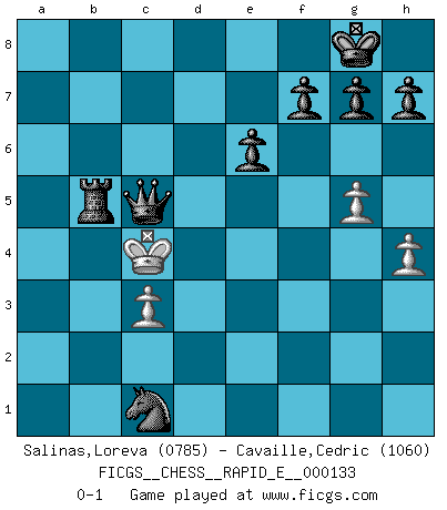 Last move : 0-1 2014 October 28 17:20:2 [Event "FICGS__CHESS__RAPID_E__000133"] [Site "FICGS"] [Date "2014.07.20"] [Round "1"] [White "Salinas,Loreva"] [Black "Cavaille,Cedric"] [Result "0-1"] [WhiteElo "0785"] [BlackElo "1060"] 1.e3 c5 2.Qg4 d6 3.Qe4 Nf6 4.Bb5+ Bd7 5.Bxd7+ Qxd7 6.Qf3 e6 7.Nc3 Be7 8.Qf4 O-O 9.Ne4 Nxe4 10.Qxe4 Qc6 11.Qc4 b5 12.Qg4 Nd7 13.Nf3 Qd5 14.e4 Qc6 15.d3 Bf6 16.h4 d5 17.Bg5 dxe4 18.Bxf6 Nxf6 19.Ne5 Qd5 20.Qg5 exd3 21.Nxd3 Qe4+ 22.Qe3 Qxe3+ 23.fxe3 c4 24.Nb4 Ng4 25.e4 Rfd8 26.Rd1 Rxd1+ 27.Kxd1 Nf2+ 28.Ke1 Nxh1 29.Ke2 Ng3+ 30.Kf3 Nh5 31.g4 a5 32.Nc6 Nf6 33.Kf4 a4 34.Nd4 b4 35.e5 c3 36.bxc3 Nd5+ 37.Ke4 Nxc3+ 38.Kd3 Nxa2 39.Kc4 Rb8 40.g5 Nc1 41.Nb5 a3 42.Kxb4 a2 43.Kc4 a1Q 44.Kc5 Qxe5+ 45.Kc4 Rxb5 46.c3 Qc5+ 0-1 Van't Kruijs Opening Kingside Castling by player Black (move 8) Promotion Queen by player Black (move 43) Player Black won this chess game. Follow this game move after move (download)Checkers is for tramps. (Paul Morphy) Wie, soll nun auch die Opposition abgeschafft werden? Ja, es tut mir leid, Ihnen diesen Schmerz nicht ersparen zu können. (Aaron Nimzowitsch) Las combinaciones han sido siempre el aspecto más intrigante del Ajedrez. Los Maestros las buscan, el público las aplauden, los críticos las alaban. La razón se debe a que las combinaciones hacen posible que el Ajedrez sea más que un ejercicio matemático con una carencia de vida. Ellas son la poesía del juego, son del Ajedrez lo que la melodía es de la música. Ellas representan el triunfo de la mente sobre la materia. (Reuben Fine) Le moment que je préfère le plus dans une rencontre, c'est celui où je sens que la personnalité de l'adversaire se brise. (Robert Fischer) Be who you are, and say what you feel because those who mind don't matter, and those who matter don't mind. (Dr Seuss)