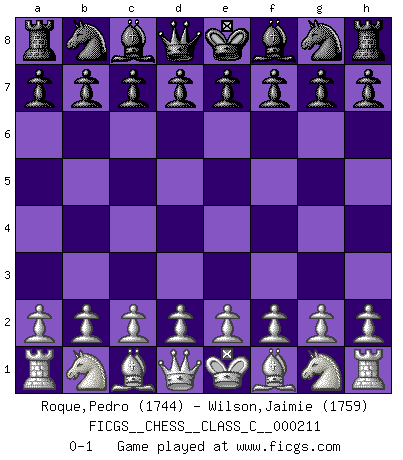 Last move : 0-1 2014 September 18 20:7:9 [Event "FICGS__CHESS__CLASS_C__000211"] [Site "FICGS"] [Date "2014.07.25"] [Round "1"] [White "Roque,Pedro"] [Black "Wilson,Jaimie"] [Result "0-1"] [WhiteElo "1744"] [BlackElo "1759"] 0-1 This chess game has been lost on time (started : 2014.07.25 16:0:54) Player Black won this chess game. Follow this game move after move (download)Castle early and often. (Rob Sillars) Früher wurde jeder komplizierte Zug, jedes interessante Opfer mit großem Beifall und Enthusiasmus aufgenommen. Heute schaltet man einfach seinen Fritz an, und man kann sehen, was los ist, ob der Zug geht oder nicht. (Vladimir Kramnik) Un entendimiento minucioso de las típicas continuaciones de mate hacen de las mas complicadas combinaciones de sacrificio que conducen hacia ellas no solo no dificiles, sino casi un asunto de rutina. (Siegbert Tarrasch) Un journaliste : 'Vous préférez avoir une dame de plus sur l'échiquier ou au lit ?' Boris Spassky : 'Ca dépend de la position.' . 'gn is not allowed in chess unless n is an integer between 1 and 8 inclusive, where 1 and 8 are to interpreted as the standard numerals standing for integers in the ordered real-closed field R, with the *canonical* ordering. (As opposed to, say, an integer in the domain Z[2+i*sqrt(5)] or an integer in some exotic Grothendieck topos). (Normajean Yates)