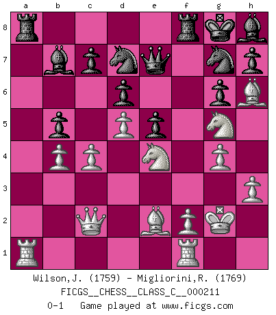 Last move : 0-1 2015 January 20 17:26:7 [Event "FICGS__CHESS__CLASS_C__000211"] [Site "FICGS"] [Date "2014.07.25"] [Round "1"] [White "Wilson,Jaimie"] [Black "Migliorini,Roberto"] [Result "0-1"] [WhiteElo "1759"] [BlackElo "1769"] 1.d4 Nf6 2.c4 g6 3.Nc3 Bg7 4.e4 d6 5.h3 O-O 6.Be3 e5 7.d5 Nbd7 8.Nf3 Nc5 9.Qc2 b6 10.b4 Ncd7 11.a3 a5 12.Rc1 Nh5 13.g3 Bh8 14.Be2 axb4 15.axb4 Bb7 16.O-O Ng7 17.Bh6 Qe7 18.Kg2 f5 19.Ng5 fxe4 20.Ncxe4 Rfe8 21.g4 Rf8 22.Ra1 b5 0-1 This chess game has been lost on time (started : 2014.07.25 16:0:54) King's Indian : Makagonov system (5.h3) Kingside Castling by player Black (move 5) Kingside Castling by player White (move 16) Player Black won this chess game. Follow this game move after move (download)Chess demands total concentration. (Bobby Fischer) Man braucht nicht immer den besten Zug zu spielen: Ein Zug muß aktiv, unternehmungslustig, korrekt und schön sein. (David Bronstein) Fischer no está bajo la obligación de nadie. (Joseph Platz) Les échecs, c'est la lutte contre l'erreur. (Johannes Zukertort) If you ain't just a little scared when you enter a casino, you are either very rich or you haven't studied the games enough. (Pappy)