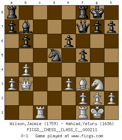 Last move : 0-1 2015 January 26 6:28:25 [Event "FICGS__CHESS__CLASS_C__000211"] [Site "FICGS"] [Date "2014.07.25"] [Round "1"] [White "Wilson,Jaimie"] [Black "Aahlad,Yeturu"] [Result "0-1"] [WhiteElo "1759"] [BlackElo "1636"] 1.d4 Nf6 2.c4 e6 3.Nc3 Bb4 4.e3 O-O 5.Nge2 d5 6.a3 Bd6 7.Ng3 c5 8.dxc5 Bxc5 9.b4 Be7 10.Bb2 Nc6 11.Na4 b6 12.cxd5 Nxd5 13.Rc1 Bb7 14.Be2 f5 15.O-O Bf6 16.Nc3 Nce7 17.Qb3 Nxc3 18.Bxc3 Nd5 19.Bxf6 Qxf6 20.Bf3 Qf7 0-1 This chess game has been lost on time (started : 2014.07.25 16:0:54) Nimzo-Indian : 4.e3 O-O Kingside Castling by player Black (move 4) Kingside Castling by player White (move 15) Player Black won this chess game. Follow this game move after move (download)What is the object of playing a gambit opening?... To acquire a reputation of being a dashing player at the cost of losing a game. (Siegbert Tarrasch) Schachspieler können ausgezeichnet Varianten am Schachbrett berechnen, aber nicht im realen Leben. Zu stark ist der Individualismus im Schach ausgeprägt, und für viele ist ein kleiner momentaner persönlicher Vorteil wichtiger als ein weit größerer Vorteil von morgen. (Anatoly Karpov) Alekhine es un poeta que crea un trabajo de arte de algo que raramente inspiraría a otra persona a mandar una tarjeta postal. (Max Euwe) Les Echecs représentent une sphère d'idées créatrices basée sur la volonté des deux protagonistes. (Smyslov) Luck never gives; it only lends. (Swedish proverb)