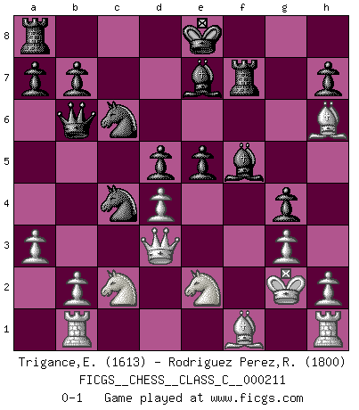 Last move : 0-1 2014 August 6 11:18:57 [Event "FICGS__CHESS__CLASS_C__000211"] [Site "FICGS"] [Date "2014.07.25"] [Round "1"] [White "Trigance,Emile"] [Black "Rodriguez Perez,Rene"] [Result "0-1"] [WhiteElo "1613"] [BlackElo "1800"] 1.e4 e6 2.d4 d5 3.Nd2 Nf6 4.e5 Nfd7 5.f4 c5 6.c3 Nc6 7.Ndf3 Qb6 8.g3 cxd4 9.cxd4 Bb4+ 10.Kf2 g5 11.Ne2 g4 12.Ne1 f6 13.a3 Be7 14.Kg2 fxe5 15.fxe5 Rf8 16.Rb1 Ndxe5 17.Bh6 Rf6 18.Bg7 Nc4 19.Qd3 Rf7 20.Bh6 e5 21.Nc2 Bf5 0-1 French : Tarrasch, Closed variation Player Black won this chess game. Follow this game move after move (download)Chess, like love, is infectious at any age. (Flohr) Den Ruhm habe ich schon, jetzt brauche ich noch das Geld. (Wilhelm Steinitz) Bobby Fischer es el jugador de Ajedrez mas grande que jamás haya existido. (Ken Smith) Les échecs sont plus proches de l'art de l'assassinat que de l'art de la guerre. (Arturo Perez-Reverte) The right perception of any matter and a misunderstanding of the same matter do not wholly exclude each other. (Kafka's the trial)