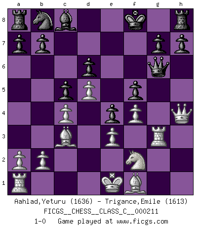 Last move : 1-0 2014 November 4 16:15:31 [Event "FICGS__CHESS__CLASS_C__000211"] [Site "FICGS"] [Date "2014.07.25"] [Round "1"] [White "Aahlad,Yeturu"] [Black "Trigance,Emile"] [Result "1-0"] [WhiteElo "1636"] [BlackElo "1613"] 1.c4 Nf6 2.d4 e6 3.Nc3 Bb4 4.f3 c5 5.d5 Nh5 6.Nh3 d6 7.Nf2 Qh4 8.Bd2 Bxc3 9.Bxc3 e5 10.e3 f5 11.f4 e4 12.g3 Nxg3 13.hxg3 Qxg3 14.Qh5+ Kf8 15.Rh3 Qg1 16.Qh4 Qg6 17.Rg3 1-0 English, 1...Nf6 (Anglo-Indian defense) Player White won this chess game. Follow this game move after move (download)Chess is everything: art, science and sport. (Anatoly Karpov) Korrekt heißt in Deutschland die Haltung eines Mannes, dessen Benehmen nach dem Urteile seiner Nachbarn seiner Stellung angemessen ist. Um korrekt zu sein, muß man sich der Meinung der anderen anpassen... (Emanuel Lasker) Un Peón pasado es un criminal, quién debe ser mantenido bajo candado y llave. Leves medidas, tales como vigilancia policiaca, no son suficientes. (Aaron Nimzovich) A chaque perte on perd un peu de soi. (Joël Lautier) A computer lets you make more mistakes faster than any invention in human history - with the possible exceptions of handguns and tequila. (Mitch Ratcliffe)