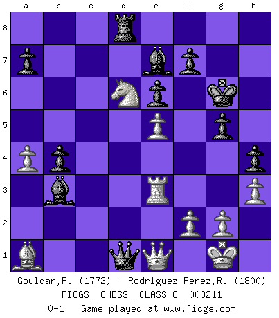 Last move : 0-1 2015 March 11 14:20:9 [Event "FICGS__CHESS__CLASS_C__000211"] [Site "FICGS"] [Date "2014.07.25"] [Round "1"] [White "Gouldar,Frances"] [Black "Rodriguez Perez,Rene"] [Result "0-1"] [WhiteElo "1772"] [BlackElo "1800"] 1.e4 e6 2.d4 d5 3.Nc3 Nf6 4.e5 Nfd7 5.Nf3 c5 6.Bb5 Nc6 7.O-O cxd4 8.Ne2 Qb6 9.Nexd4 Nxd4 10.Nxd4 Bc5 11.Bxd7+ Bxd7 12.c3 O-O 13.Nb3 Be7 14.Be3 Qc7 15.Bd4 Ba4 16.Re1 b6 17.Re3 Rac8 18.Rg3 Rfe8 19.Qg4 g6 20.Rh3 Qc4 21.Nd2 Qa6 22.b3 Bb5 23.Nf3 Bd3 24.Qf4 h5 25.Rg3 Kg7 26.h3 Rh8 27.Nd2 h4 28.Rf3 Bf5 29.c4 Rh5 30.Qe3 Qb7 31.Rc1 dxc4 32.Rxc4 R5h8 33.Qf4 g5 34.Qe3 Kg6 35.Rxc8 Rxc8 36.Bc3 Qd5 37.Qe1 b5 38.a4 b4 39.Ba1 Rd8 40.Nc4 Qd1 41.Re3 Bc2 42.Nd6 Bxb3 0-1 Comment by player 1 : Frances Gouldar : hello and good game. French : Steinitz variation Kingside Castling by player White (move 7) Kingside Castling by player Black (move 12) Player Black won this chess game. Follow this game move after move (download)Chess is really ninety nine percent calculation. (Soltis) Obwohl ich vom Stil her kaum zu den Priestern der Schachkunst gezählt werde, halte ich Schach doch für eine Kunst. (Tigran Petrosjan) Aquellos que dicen entender al Ajedrez, no entienden nada. (Robert Hubner) Le moment que je préfère le plus dans une rencontre, c'est celui où je sens que la personnalité de l'adversaire se brise. (Robert Fischer) Who needs drugs and alcohol if he can play Big Chess at FICGS ? (Heinz-Georg Lehnhoff)