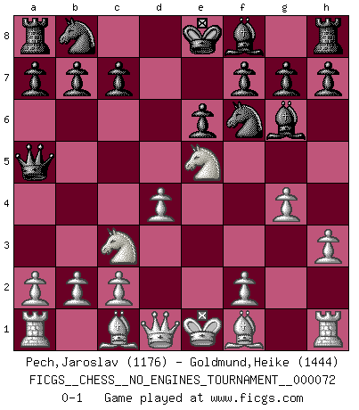 Last move : 0-1 2014 October 1 8:47:6 [Event "FICGS__CHESS__NO_ENGINES_TOURNAMENT__000072"] [Site "FICGS"] [Date "2014.07.26"] [Round "1"] [White "Pech,Jaroslav"] [Black "Goldmund,Heike"] [Result "0-1"] [WhiteElo "1176"] [BlackElo "1444"] 1.e4 d5 2.exd5 Qxd5 3.Nc3 Qa5 4.d4 Nf6 5.Nf3 Bg4 6.h3 Bh5 7.g4 Bg6 8.Ne5 e6 0-1 This chess game has been lost on time (started : 2014.07.26 15:23:46) Scandinavian defense, Lasker variation Player Black won this chess game. Follow this game move after move (download)You need not play well - just help your opponent to play badly. (Genrikh Chepukaitis) Ich hatte meine größten Erfolge, als ich 47 Jahre alt war. Kasparow war noch nicht mal 42 und hat das Schach schon im Stich gelassen. (Viktor Kortschnoi) Un Peón pasado es un criminal, quién debe ser mantenido bajo candado y llave. Leves medidas, tales como vigilancia policiaca, no son suficientes. (Aaron Nimzovich) Les Echecs représentent une sphère d'idées créatrices basée sur la volonté des deux protagonistes. (Smyslov) Lottery : A tax on people who are bad at math. (Author unknown)