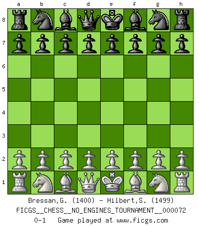 Last move : 0-1 2014 September 4 18:51:2 [Event "FICGS__CHESS__NO_ENGINES_TOURNAMENT__000072"] [Site "FICGS"] [Date "2014.07.26"] [Round "1"] [White "Bressan,Giulio"] [Black "Hilbert,Stephan J."] [Result "0-1"] [WhiteElo "1400"] [BlackElo "1499"] 0-1 This chess game has been lost on time (started : 2014.07.26 15:23:46) Player Black won this chess game. Follow this game move after move (download)I still hope to kill Fischer. (Boris Spassky) Über die Verhaftung Bobby Fischers: Warum es die Bush-Administration für nötig befindet einen 61 Jahre alten Mann zu hetzten, der für niemanden ausser sich selbste eine Gefahr darstellt ist ein Rätsel. (Nigel Short) El Ajedrez es un invernadero donde los frutos del carácter pueden madurar mas completamente que en la vida. (Edward Morgan Foster) Même si l'adversaire joue le coup analysé précédemment, recommencez l'analyse en voyant la nouvelle position. Première règle de Blumenfeld It's not a bug - it's an undocumented feature. (Anonymous)