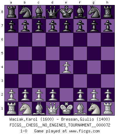 Last move : 1-0 2014 September 4 18:51:2 [Event "FICGS__CHESS__NO_ENGINES_TOURNAMENT__000072"] [Site "FICGS"] [Date "2014.07.26"] [Round "1"] [White "Waciak,Karol"] [Black "Bressan,Giulio"] [Result "1-0"] [WhiteElo "1600"] [BlackElo "1400"] 1.e4 1-0 This chess game has been lost on time (started : 2014.07.26 15:23:46) King's pawn Opening Player White won this chess game. Follow this game move after move (download)No price is too great for the scalp of the enemy King. (Koblentz) Zu meiner Zeit war ein 20 jähriger ein junger Spieler, heute ist er ein Veteran. (Garry Kasparov) Si pudieramos observar el interior de la cabeza de un jugador de Ajedrez, encontraríamos ahí un mundo lleno de sentimientos, imágenes, ideas, emoción y pasión. (Alfred Binet) On croit qu'il y a plus de mauvais joueurs que de bons joueurs, c'est faux : Il y a autant de joueurs qui gagnent que de joueurs qui perdent. (Philippe Geluck) Pretend inferiority and encourage his arrogance. (Sun Tzu)