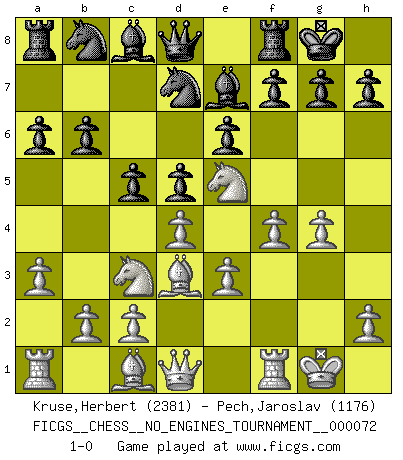 Last move : 1-0 2014 September 5 6:56:9 [Event "FICGS__CHESS__NO_ENGINES_TOURNAMENT__000072"] [Site "FICGS"] [Date "2014.07.26"] [Round "1"] [White "Kruse,Herbert"] [Black "Pech,Jaroslav"] [Result "1-0"] [WhiteElo "2381"] [BlackElo "1176"] 1.e3 Nf6 2.Nc3 c5 3.Nf3 d5 4.d4 e6 5.Bd3 Be7 6.O-O O-O 7.a3 b6 8.Ne5 a6 9.g4 Nfd7 10.f4 1-0 This chess game has been lost on time (started : 2014.07.26 15:23:46) Van't Kruijs Opening Kingside Castling by player White (move 6) Kingside Castling by player Black (move 6) Player White won this chess game. Follow this game move after move (download)Any material change in a position must come about by mate, a capture, or a Pawn promotion. (Purdy) Die meiste Zeit treffe ich auf Gegner, die meine Enkel sein könnten. Ich bin da, um ihnen zu zeigen, dass sie von mir noch einiges lernen können. (Viktor Kortschnoi) Vive, pierde y aprende al observar a tu oponente como ganar. (Amber Steenbock) D'abord les bases : Jouez et étudiez, puis étudiez et jouez, ensuite jouez et étudiez, puis étudiez et jouez. Deuxièmement : Donnez toujours le meilleur de vous-même ! (Ken Smith) Political correctness is subjecting us to gross incompetence. (Johann Piek)
