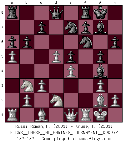 Last move : 1/2-1/2 2014 November 1 3:49:43 [Event "FICGS__CHESS__NO_ENGINES_TOURNAMENT__000072"] [Site "FICGS"] [Date "2014.07.26"] [Round "1"] [White "Russi Roman,Tano-Urayoan"] [Black "Kruse,Herbert"] [Result "1/2-1/2"] [WhiteElo "2091"] [BlackElo "2381"] 1.d4 a6 2.g3 g6 3.Bg2 Bg7 4.c3 d5 5.Nf3 Nf6 6.O-O O-O 7.a4 Bf5 8.Nbd2 Nc6 9.a5 b6 10.Nb3 Be4 11.Bh3 e6 12.Nfd2 Bf5 13.Bg2 g5 14.f3 e5 15.e4 dxe4 16.fxe4 Bg4 17.Qe1 h6 18.d5 Ne7 1/2-1/2 Queen's pawn Kingside Castling by player White (move 6) Kingside Castling by player Black (move 6) This chess game ended in a draw. Follow this game move after move (download)Fischer is the strongest player in the world. In fact, the strongest player who ever lived. (Larry Evans) Alles was am Schachbrett zählt sind gute Züge. (Robert James Fischer) Un juego de Ajedrez es un dialogo, una conversación entre un jugador y su oponente. Cada movimiento del oponente puede contener amenazas o tropiezos, pero un jugador no se puede defender de las amenazas o tomar ventaja de los tropiezos si es que no se pregunta a sí mismo: ¿Que es lo que mi oponente va a hacer después de cada movida?. (Bruce A. Moon) C'est la seule position que je connaisse où les deux camps sont mals. Propos prêtés à V. Anand. Pushing plastic is for the many, pushing virtual pieces is for the fewer, pushing wood is for the very few. (Normajean Yates)
