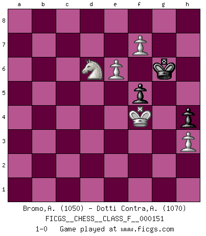 Last move : 1-0 2014 August 26 18:10:41 [Event "FICGS__CHESS__CLASS_F__000151"] [Site "FICGS"] [Date "2014.07.26"] [Round "1"] [White "Bromo,Alexis"] [Black "Dotti Contra,Alessandro"] [Result "1-0"] [WhiteElo "1050"] [BlackElo "1070"] 1.d4 d5 2.c4 Nf6 3.Nc3 e6 4.a3 Be7 5.Nf3 O-O 6.h3 Nc6 7.e3 dxc4 8.Bxc4 a6 9.O-O b5 10.Bb3 b4 11.axb4 Bxb4 12.Bd2 Rb8 13.Re1 Ba5 14.Na4 Bxd2 15.Qxd2 Rxb3 16.Nc5 Rb8 17.Nxa6 Ra8 18.Nc5 Rxa1 19.Rxa1 Bd7 20.Ra6 h6 21.Ne5 Nxe5 22.dxe5 Nd5 23.e4 Nb6 24.Rxb6 Bc8 25.Qxd8 Rxd8 26.Rb8 Rf8 27.f4 g6 28.g4 Kg7 29.Kg2 h5 30.g5 Rg8 31.b4 c6 32.b5 cxb5 33.Rxb5 Rd8 34.Rb8 Rd2+ 35.Kg3 Rd8 36.Nb7 Rd7 37.Nd6 Rd8 38.f5 gxf5 39.exf5 exf5 40.Rxc8 Rxc8 41.Nxc8 Kg6 42.Kf4 h4 43.Nd6 f6 44.gxf6 Kh7 45.e6 Kg6 46.f7 1-0 QGD : Marshall defense Kingside Castling by player Black (move 5) Kingside Castling by player White (move 9) 10 pieces endgame at move 40 : White KNPPP , Black KRPPP WHITE : King + 1 Knight 3 Pawns BLACK : King + 1 Rook 3 Pawns 9 pieces endgame at move 41 : White KNPPP , Black KPPP WHITE : King + 1 Knight 3 Pawns BLACK : King + 3 Pawns 8 pieces endgame at move 44 : White KNPPP , Black KPP WHITE : King + 1 Knight 3 Pawns BLACK : King + 2 Pawns Player White won this chess game. Follow this game move after move (download)Without error there can be no brilliancy. (Emanuel Lasker) Wenn es im Universum noch irgendwo intelligente Lebewesen gibt, dann kennen sie Go. (Emanuel Lasker) Personalmente, yo prefiero mirar hacia el futuro en donde un programa de computadora gane el título mundial de Ajedrez. La humanidad necesita una lección de humildad. (Richard Dawkings) Il (Jacob Murray) ne joue pas pour le bon coup, mais pour le meilleur. (Eloi Relange) Being number two sucks. (Andre Agassi)