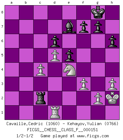 Last move : 1/2-1/2 2014 September 21 0:56:29 [Event "FICGS__CHESS__CLASS_F__000151"] [Site "FICGS"] [Date "2014.07.26"] [Round "1"] [White "Cavaille,Cedric"] [Black "Kehayov,Yulian"] [Result "1/2-1/2"] [WhiteElo "1060"] [BlackElo "0766"] 1.e4 e5 2.Nf3 d6 3.d4 Nc6 4.d5 Nb8 5.c4 Nf6 6.Bd3 h6 7.O-O Be7 8.b4 O-O 9.a4 c6 10.b5 cxb5 11.axb5 Bd7 12.Qb3 a6 13.bxa6 Nxa6 14.Qxb7 Nc5 15.Qxa8 Qxa8 16.Rxa8 Rxa8 17.Rd1 Ncxe4 18.Bxe4 Nxe4 19.Bd2 Nxd2 20.Nbxd2 Bg4 21.h3 Bxf3 22.Nxf3 Ra4 23.Nd2 Ra2 24.f3 Bg5 25.Ne4 Be7 26.Kh2 Rc2 27.Nd2 Bg5 28.Ne4 Be7 29.Nd2 Bg5 30.Ne4 Be7 1/2-1/2 Philidor's defense Kingside Castling by player White (move 7) Kingside Castling by player Black (move 8) This chess game ended in a draw. Follow this game move after move (download)Pawns are born free, yet they are everywhere in chains. (Rick Kennedy) Obwohl ich vom Stil her kaum zu den Priestern der Schachkunst gezählt werde, halte ich Schach doch für eine Kunst. (Tigran Petrosjan) Una buena ofensiva y una buena defensa, comienzan ambas con un buen desarrollo. (Bruce A. Moon) La menace est plus forte que l'exécution. (Aaron Nimzovitch) Creativity involves breaking out of established patterns in order to look at things in a different way. (Edward De Bono)
