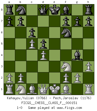 Last move : 1-0 2014 September 13 7:39:56 [Event "FICGS__CHESS__CLASS_F__000151"] [Site "FICGS"] [Date "2014.07.26"] [Round "1"] [White "Kehayov,Yulian"] [Black "Pech,Jaroslav"] [Result "1-0"] [WhiteElo "0766"] [BlackElo "1176"] 1.e4 e6 2.Nf3 d5 3.exd5 exd5 4.d4 Nf6 5.c4 c6 6.c5 Bg4 7.h3 1-0 This chess game has been lost on time (started : 2014.07.26 20:28:33) French defense Player White won this chess game. Follow this game move after move (download)The hardest game to win is a won game. (Emanuel Lasker) Karpov ist ein Museumsstück. (Garry Kasparov) ¡Examina movidas que hagan daño! Un buen ojo for movidas desvastantes es mucho mas importante que el conocimiento de principios estratégicos. (Purdy) Même si vous avez un bon coup à faire, regardez toujours s'il n'y en a pas un qui lui soit préférable. (Pedro Damiano) If things go wrong, don't go with them. (Roger Babson)
