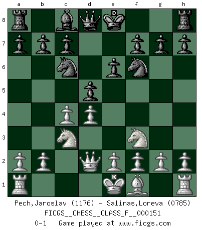 Last move : 0-1 2014 September 13 18:47:2 [Event "FICGS__CHESS__CLASS_F__000151"] [Site "FICGS"] [Date "2014.07.26"] [Round "1"] [White "Pech,Jaroslav"] [Black "Salinas,Loreva"] [Result "0-1"] [WhiteElo "1176"] [BlackElo "0785"] 1.d4 e6 2.c4 Bb4+ 3.Bd2 Bxd2+ 4.Qxd2 Nf6 5.Nc3 d5 6.Nf3 Nc6 0-1 This chess game has been lost on time (started : 2014.07.26 20:28:33) Queen's pawn : Franco-Indian (Keres) defense Player Black won this chess game. Follow this game move after move (download)The essence of Chess is thinking about what Chess is. (David Bronstein) Im Fernschach kannst du während dem Spiel rauchen. (John Christen Knudsen) Un juego de Ajedrez es un dialogo, una conversación entre un jugador y su oponente. Cada movimiento del oponente puede contener amenazas o tropiezos, pero un jugador no se puede defender de las amenazas o tomar ventaja de los tropiezos si es que no se pregunta a sí mismo: ¿Que es lo que mi oponente va a hacer después de cada movida?. (Bruce A. Moon) On est toujours la mazette de quelqu'un d'autre. (Anonyme) The only thing that overcomes hard luck is hard work. (Harry Golden)