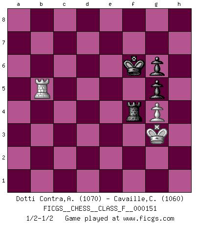 Last move : 1/2-1/2 2014 November 1 21:55:53 [Event "FICGS__CHESS__CLASS_F__000151"] [Site "FICGS"] [Date "2014.07.26"] [Round "1"] [White "Dotti Contra,Alessandro"] [Black "Cavaille,Cedric"] [Result "1/2-1/2"] [WhiteElo "1070"] [BlackElo "1060"] 1.e4 e5 2.Nf3 d6 3.Bc4 h6 4.O-O Be7 5.d3 Nc6 6.Nc3 Nf6 7.Be3 O-O 8.h3 a6 9.a3 b5 10.Bb3 Na5 11.Bd5 Nxd5 12.Nxd5 Bb7 13.Nc3 c5 14.b4 cxb4 15.axb4 Nc6 16.Nd5 a5 17.bxa5 Rxa5 18.Rb1 Qa8 19.c3 Bd8 20.Bb6 Bxb6 21.Nxb6 Qd8 22.Nd5 Ne7 23.Nb4 d5 24.Nxe5 dxe4 25.dxe4 Bxe4 26.Qxd8 Rxd8 27.Rbc1 Rc8 28.f3 Rc5 29.Nd7 Rc4 30.fxe4 Rxe4 31.Rfe1 Rxe1+ 32.Rxe1 Nf5 33.Re8+ Kh7 34.Ne5 f6 35.g4 Nh4 36.Rb8 fxe5 37.Nc6 Ra3 38.Rxb5 Rxc3 39.Nxe5 Rxh3 40.Rb7 Nf3+ 41.Kg2 Ng5 42.Nf7 Rd3 43.Nxg5+ hxg5 44.Kf2 Kg6 45.Rb6+ Kf7 46.Rb5 Kf6 47.Ke2 Rg3 48.Rb4 g6 49.Kf2 Rc3 50.Rb6+ Ke5 51.Rb4 Rd3 52.Ke2 Rd6 53.Kf3 Rf6+ 54.Kg3 Rf4 55.Rb5+ Kf6 1/2-1/2 Philidor's defense Kingside Castling by player White (move 4) Kingside Castling by player Black (move 7) 10 pieces endgame at move 39 : White KRNPP , Black KRNPP WHITE : King + 1 Rook 1 Knight 2 Pawns BLACK : King + 1 Rook 1 Knight 2 Pawns 9 pieces endgame at move 39 : White KRNP , Black KRNPP WHITE : King + 1 Rook 1 Knight 1 Pawn BLACK : King + 1 Rook 1 Knight 2 Pawns 8 pieces endgame at move 43 : White KRNP , Black KRPP WHITE : King + 1 Rook 1 Knight 1 Pawn BLACK : King + 1 Rook 2 Pawns 7 pieces endgame at move 43 : White KRP , Black KRPP WHITE : King + 1 Rook 1 Pawn BLACK : King + 1 Rook 2 Pawns This chess game ended in a draw. Follow this game move after move (download)Weak points or holes in the opponent's position must be occupied by pieces not Pawns. (Siegbert Tarrasch) Der Partner hat auch seine Existenzberechtigung. (Savielly Grigorievitsch Tartakower) El Ajedrez es un juego de pelea el cual es puramente intelectual e incluye la suerte. (Richard Reti) Votre seul travail dans les ouvertures est d'obtenir un milieu de partie jouable. (Lajos Portish) All maxims have their antagonist maxims; proverbs should be sold in pairs, a single one being but a half truth. (William Mathews)