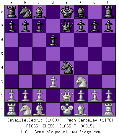 Last move : 1-0 2014 September 6 16:17:31 [Event "FICGS__CHESS__CLASS_F__000151"] [Site "FICGS"] [Date "2014.07.26"] [Round "1"] [White "Cavaille,Cedric"] [Black "Pech,Jaroslav"] [Result "1-0"] [WhiteElo "1060"] [BlackElo "1176"] 1.e4 e5 2.Nf3 Nf6 3.Nxe5 d6 4.Nf3 Nxe4 5.Qe2 Qe7 6.d3 1-0 This chess game has been lost on time (started : 2014.07.26 20:28:33) Petrov : Cozio (Lasker) attack Player White won this chess game. Follow this game move after move (download)It began to feel as though you were playing against Chess itself. - On playing against Robert Fischer. (Walter Shipman) Ein typischer, sehr verbreiteter Gedankenschädling ist der, daß der betreffende Amateur von der Annanhme ausgeht, daß jeder einzelne Zug etwas zu leisten habe. (Aaron Nimzowitsch) El hombre es un frívolo, una creatura engañosa y como un jugador de Ajedrez, se preocupa mas por el proceso de obtener su meta que de la meta por sí misma. (Dostoyevsky) La solitude du joueur d'Echecs à l'approche du mat est semblable à celle du condamné. (Francis Szpiner) Life is pain my dear and anyone who says otherwise is selling something. (Princess Bride)