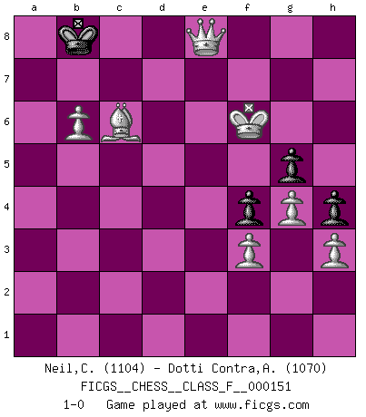 Last move : 1-0 2014 November 11 22:21:50 [Event "FICGS__CHESS__CLASS_F__000151"] [Site "FICGS"] [Date "2014.07.26"] [Round "1"] [White "Neil,Charlie"] [Black "Dotti Contra,Alessandro"] [Result "1-0"] [WhiteElo "1104"] [BlackElo "1070"] 1.d4 d5 2.Nf3 Nf6 3.c4 Nc6 4.Nc3 Bg4 5.e3 e6 6.Be2 Bd6 7.h3 Bh5 8.cxd5 Nxd5 9.e4 Nf4 10.O-O O-O 11.Be3 Bxf3 12.Bxf3 e5 13.d5 Nb4 14.Bxf4 exf4 15.a3 Na6 16.Qd3 Nc5 17.Qc4 a6 18.Rac1 Qd7 19.b4 Na4 20.Rfe1 Nb2 21.Qe2 Na4 22.Qc2 Nxc3 23.Qxc3 Be5 24.Qxe5 Qd6 25.Qxd6 cxd6 26.Rc7 Rab8 27.Rd7 Rfd8 28.Rxd8+ Rxd8 29.Rc1 g6 30.Rc7 b5 31.Bg4 h5 32.Be2 Kg7 33.Rc6 Ra8 34.Rxd6 Ra7 35.Rc6 Re7 36.f3 Ra7 37.Kf2 f6 38.Bd3 g5 39.g4 h4 40.Ke2 Kf7 41.Kd2 Ke7 42.Kc3 Kf7 43.Kd4 a5 44.Bxb5 axb4 45.axb4 Ra3 46.Rc3 Ra1 47.Bc6 Rg1 48.b5 Rb1 49.d6 Ke6 50.d7 Ke7 51.Kc5 Kd8 52.Kd6 Re1 53.Ra3 Rd1+ 54.Ke6 Kc7 55.Ra7+ Kd8 56.Ra8+ Kc7 57.d8Q+ Rxd8 58.Rxd8 Kxd8 59.Kxf6 Kc7 60.e5 Kd8 61.e6 Kc7 62.e7 Kc8 63.b6 Kb8 64.e8Q+ 1-0 Queen's pawn game Kingside Castling by player White (move 10) Kingside Castling by player Black (move 10) Promotion Queen by player White (move 57) Promotion Queen by player White (move 64) Player White won this chess game. Follow this game move after move (download)If a ruler does not understand Chess, how can he rule over a kingdom ? (King Khusros II) Ein Remis kann durch Wiederholung von drei Zügen oder durch einen schlechte Zug erreicht werden. (Savielly Grigorievitsch Tartakower) Yo tuve un dolor de muelas en la primer partida. En el segundo juego, tuve un dolor de cabeza. En el tercero, tuve un ataque de reumatísmo. En la cuarta partida, no me sentía muy bien. ¿Y en el quinto juego? Bueno, ¿que acaso uno tiene que ganar todos los juegos?. (Siegbert Tarrasch) Le temps de noter son nom sur la feuille de partie, j'étais déjà en zeitnot ! D'un modeste amateur apparié lors de la première ronde d'un open contre le grand-maître Azmaïparashvili. They misunderestimated me. (George W. Bush, Bentonville nov. 6, 2000)