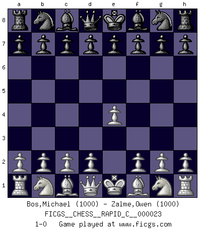 Last move : 1-0 2007 March 22 7:47:30 [Event "FICGS__CHESS__RAPID_C__000023"] [Site "FICGS"] [Date "2007.02.19"] [Round "1"] [White "Bos,Michael"] [Black "Zalme,Owen"] [Result "1-0"] [WhiteElo "1000"] [BlackElo "1000"] 1.e4 1-0 This chess game has been lost on time (started : 2007.02.19 20:52:39) King's pawn Opening Player White won this chess game. Follow this game move after move (download)Chess is the gymnasium of the mind. (Blaise Pascal) Jeder Schachmeister war einmal ein Anfänger. (Irving Chernev) Botvinnik trataba de restarle el misterio al Ajedrez, siempre relacionandolo a situaciones de la vida ordinaria. El gustaba de llamar al Ajedrez un típico problema inexacto similar a aquellos de los cuales la gente siempre tiene que enfrentarse en la vida cotidiana. (Garry Kasparov) Des idées, des idées, j'en ai cent, j'en ai mille. Des bonnes, des mauvaises, applicables, irréalisables... Il suffit de faire le tri ! (Roos) A mistake is only a mistake if you let it happen twice. Otherwise it is a learning experience. (Daniel Parmet)