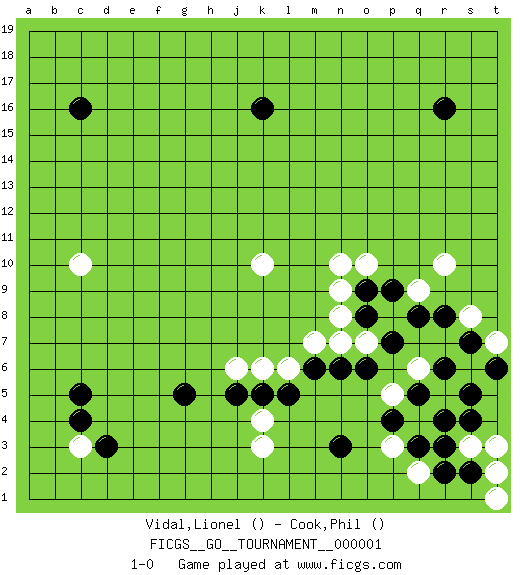 Last move : 1-0 2006 July 10 10:27:16 [Event "FICGS__GO__TOURNAMENT__000001"] [Site "FICGS"] [Date "2006.05.26"] [Round "1"] [Black "Vidal,Lionel"] [White "Cook,Phil"] [Result "1-0"] 1.r16 k10 2.q3 q4 3.r3 r10 4.c16 c10 5.d3 k3 6.c5 c3 7.c4 p3 8.s5 s3 9.s2 t1 10.s4 t3 11.k16 q2 12.r2 t2 13.r8 r5 14.r6 s6 15.q5 t7 16.s7 q9 17.q8 p8 18.p9 o10 19.o9 n9 20.o8 o7 21.p7 n8 22.o6 n7 23.n6 m7 24.m6 n10 25.n3 l6 26.l5 k4 27.k5 k6 28.j5 j6 29.g5 p5 30.r4 s8 31.t6 q6 32.p4 1-0 Here are the names of the openings (joseki) played in the four corners : Corner q4 : q3 q4 Komoku (Somok, Xiao~mu`) 3-4 Point. The komoku (3-4) point is the traditional corner enclosure move.. Player Black won this Go (weiqi, baduk) game. Follow this game move after move (download)Capture what you cut off. (Anonymous) A good programmer is someone who always looks both ways before crossing a one-way street. (Doug Linder)