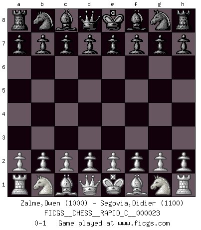 Last move : 0-1 2007 March 22 1:47:13 [Event "FICGS__CHESS__RAPID_C__000023"] [Site "FICGS"] [Date "2007.02.19"] [Round "1"] [White "Zalme,Owen"] [Black "Segovia,Didier"] [Result "0-1"] [WhiteElo "1000"] [BlackElo "1100"] 0-1 This chess game has been lost on time (started : 2007.02.19 20:52:39) Player Black won this chess game. Follow this game move after move (download)A sacrifice is best refuted by accepting it. (Wilhelm Steinitz) Wenn Dein Gegner dir ein Remis anbietet, versuch herauszufinden, weshalb er glaubt schlechter zu stehen. (Nigel Short) El sobresalir en el Ajedrez es un signo de una mente intrigante. (Sir Arthur Conan Doyle) Ce qui est bien, c'est d'avoir tout un tas de pièces en prise : l'adversaire ne peut en prendre qu'une à la fois. Cité par Thierry Audin. Computers are like Old Testament gods; lots of rules and no mercy. (Joseph Campbell)