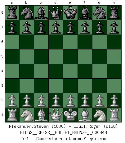 Last move : 0-1 2014 August 1 14:37:40 [Event "FICGS__CHESS__BULLET_BRONZE__000848"] [Site "FICGS"] [Date "2014.08.01"] [Round "1"] [White "Alexander,Steven"] [Black "Llull,Roger"] [Result "0-1"] [WhiteElo "1800"] [BlackElo "2168"] 0-1 This chess game has been lost on time (started : 2014.08.01 10:40:56) Player Black won this chess game. Follow this game move after move (download)A Chess game is a dialogue, a conversation between a player and his opponent. Each move by the opponent may contain threats or be a blunder, but a player cannot defend against threats or take advantage of blunders if he does not first ask himself: What is my opponent planning after each move ? (Bruce A. Moon) Ich moechte nie einem Club beitreten, der Leute wie mich als Mitglieder aufnimmt. (Woody Allen) Sin errores no puede haber brillantez. (Emanuel Lasker) Votre prénom est 'Tactique', votre deuxième prénom est 'Tactique' et votre nom est 'Tactique'. (Ken Smith) Art is the only way to run away without leaving home. (Twyla Tharp)