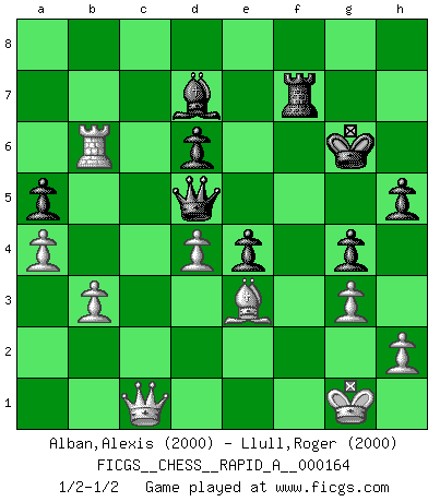 Last move : 1/2-1/2 2014 August 11 12:15:46 [Event "FICGS__CHESS__RAPID_A__000164"] [Site "FICGS"] [Date "2014.08.02"] [Round "1"] [White "Alban,Alexis"] [Black "Llull,Roger"] [Result "1/2-1/2"] [WhiteElo "2000"] [BlackElo "2000"] 1.e4 e5 2.Nf3 Nf6 3.d4 Nxe4 4.Bd3 d5 5.Nxe5 Nd7 6.Nxd7 Bxd7 7.O-O Bd6 8.c4 O-O 9.cxd5 f5 10.Nc3 Qf6 11.Ne2 g5 12.g3 Qg7 13.f3 Nf6 14.f4 g4 15.Qb3 a5 16.a4 Rfe8 17.Nc3 h5 18.Qc2 Ne4 19.Bxe4 fxe4 20.Be3 Qh7 21.f5 Bxf5 22.Nb5 Rf8 23.Qd2 Qg6 24.Nxd6 cxd6 25.b3 Rf7 26.Rac1 Bd7 27.Rxf7 Qxf7 28.Rc7 Rf8 29.Qe1 Qf5 30.Rxb7 Rf7 31.Qc1 Kg7 32.Rb6 Qxd5 33.Bh6+ Kg6 34.Be3 1/2-1/2 Petrov : Modern attack, Symmetrical variation Kingside Castling by player White (move 7) Kingside Castling by player Black (move 8) This chess game ended in a draw. Follow this game move after move (download)The essence of Chess is thinking about what Chess is. (David Bronstein) Ich bin stolz ein Bulgare zu sein. (Veselin Topalov) Cuando la partida de Ajedrez termina, el Peón y el Rey regresan a la misma caja. (Irish saying) L'action d'une oeuvre littéraire se déroule sur un champ de bataille. Les masques et les types du drame moderne correspondent aux pièces du jeu d'échecs. L'intrigue correspond aux coups et aux gambits, c'est à dire aux techniques du jeu telles qu'utilisées et interprétées par les joueurs. Les tactiques et les péripéties [mouvements] correspondent aux coups exécutés par l'adversaire. (Viktor Shklovsky) Experience is the name we all give to our mistakes. (Oscar Wilde)