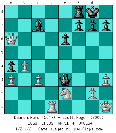 Last move : 1/2-1/2 2014 August 8 23:2:23 [Event "FICGS__CHESS__RAPID_A__000164"] [Site "FICGS"] [Date "2014.08.02"] [Round "1"] [White "Daanen,Aard"] [Black "Llull,Roger"] [Result "1/2-1/2"] [WhiteElo "2047"] [BlackElo "2000"] 1.e4 c5 2.Nf3 d6 3.d4 cxd4 4.Nxd4 Nf6 5.Nc3 a6 6.Bg5 e6 7.Qd3 b5 8.Be2 Nbd7 9.a3 Bb7 10.O-O Nc5 11.Bxf6 Qxf6 12.Qe3 Be7 13.f4 Bd8 14.Rad1 O-O 15.Bf3 Rc8 16.e5 dxe5 17.fxe5 Qe7 18.Kh1 Bb6 19.b4 Na4 20.Nxa4 bxa4 21.c3 Rfd8 22.h3 Bxf3 23.Qxf3 Qc7 24.Ne2 Rxd1 25.Rxd1 Qxe5 26.Qb7 Rf8 27.Qxa6 Bc7 28.Kg1 Qe3+ 29.Kh1 Qe5 30.Kg1 Qe3+ 31.Kh1 1/2-1/2 Sicilian : Najdorf, 6...e6 Kingside Castling by player White (move 10) Kingside Castling by player Black (move 14) This chess game ended in a draw. Follow this game move after move (download)Bobby is the finest Chess player this country ever produced. His memory for the moves, his brilliance in dreaming up combinations, and his fierce determination to win are uncanny. (John Collins) Der Traum, für den ich lebe, ist der von einem freien Russland. Viele mögen sagen: Russland hat doch ein Parlament, einen gewählten Präsidenten. Aber ich spüre, dass in meiner Heimat die Angst wiederkehrt. Eine Angst, sich frei zu äußern, bestimmte Dinge zu tun (Garry Kasparov) El jugador táctico sabe que hacer cuando hay algo que hacer; mientras que el estratega sabe que hacer cuando no hay nada que hacer. (Gerald Abrahams) Mais n'est-ce pas déjà le limiter injurieusement que d'appeler les échecs un jeu? N'est-ce pas aussi une science, un art, ou quelque chose qui, comme le cercueil de Mahomet entre ciel et terre, est suspendu entre l'un et l'autre, et qui réunit un nombre incroyable de contraires ? (Stefan Zweig) Methinks King Thibault should dub Marius Zubac a knight of the square board... I mean table, henceforth addressing him as Sir Marius, and bestow on him a suitable land from the kingdom of FICGS & marry him off to a worthy, fair maiden, lest he slice our heads with his mighty sword in his wrath. (Dinesh De Silva)