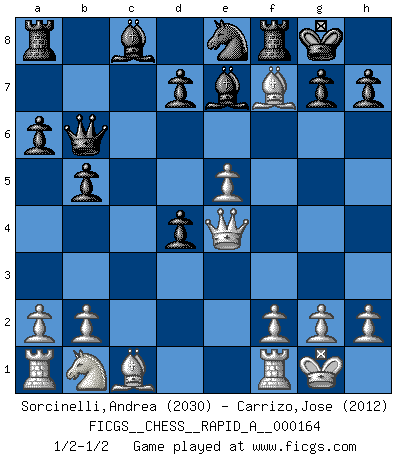 Last move : 1/2-1/2 2014 September 11 13:15:15 [Event "FICGS__CHESS__RAPID_A__000164"] [Site "FICGS"] [Date "2014.08.02"] [Round "1"] [White "Sorcinelli,Andrea"] [Black "Carrizo,Jose"] [Result "1/2-1/2"] [WhiteElo "2030"] [BlackElo "2012"] 1.e4 e5 2.Nf3 Nc6 3.Bb5 a6 4.Ba4 Nf6 5.Qe2 b5 6.Bb3 Be7 7.O-O O-O 8.d4 Nxd4 9.Nxd4 exd4 10.e5 Ne8 11.c3 c5 12.cxd4 cxd4 13.Qe4 Qb6 14.Bxf7+ 1/2-1/2 Ruy Lopez : Wormald (Alapin) attack Kingside Castling by player White (move 7) Kingside Castling by player Black (move 7) This chess game ended in a draw. Follow this game move after move (download)For me, Chess is life and every game is like a new life. Every Chess player gets to live many lives in one lifetime. (Eduard Gufeld) Spielt Blackmar-Diemer-Gambit, und das Matt kommt von selbst! (Emil Joseph Diemer) Yo considero que Fischer es uno de los expertos mas grandes de aperturas de siempre. (Keith Hayward) Demandez au pauvre Cg1 ce qu'il en pense. Eduard Gufeld à propos de la variante Saemisch de l'Est-Indienne. Chess, like love, like music, has the power to make people happy. (Siegbert Tarrasch)