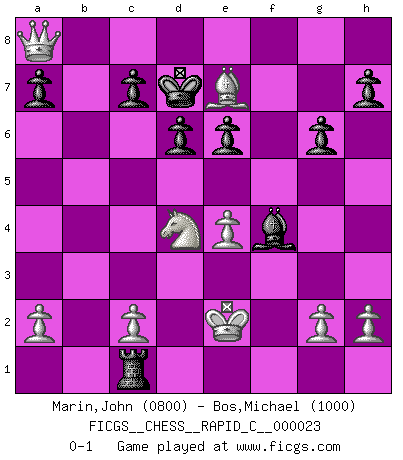 Last move : 0-1 2007 May 1 1:20:32 [Event "FICGS__CHESS__RAPID_C__000023"] [Site "FICGS"] [Date "2007.02.19"] [Round "1"] [White "Marin,John"] [Black "Bos,Michael"] [Result "0-1"] [WhiteElo "0800"] [BlackElo "1000"] 1.e4 e5 2.Nf3 Nc6 3.Bc4 d6 4.Nc3 Be6 5.Bxe6 fxe6 6.d4 exd4 7.Nxd4 Qf6 8.Qh5+ g6 9.Qb5 Qxd4 10.Qxb7 Rb8 11.Qxc6+ Kd8 12.Ne2 Qb4+ 13.Bd2 Qxb2 14.Bc3 Qxa1+ 15.Bxa1 Rb1+ 16.Kd2 Bh6+ 17.f4 Rxh1 18.Bxh8 Ne7 19.Bf6 Rf1 20.Nd4 Bxf4+ 21.Ke2 Kc8 22.Bxe7 Rc1 23.Qa8+ Kd7 0-1 This chess game has been lost on time (started : 2007.02.19 20:52:39) King's pawn game Player Black won this chess game. Follow this game move after move (download)If cunning alone were needed to excel, women would be the best Chess players. (Albin) Das Schachspiel ist ein See, in welchem eine Mücke baden und ein Elefant ertrinken kann. (Emanuel Lasker) El jugador blanco perdió porque fallo en recordar la coreccta continuación y tuvo que pensar por sí mismo las movidas. (Siegbert Tarrasch) Pour moi, les échecs ne sont pas un jeu mais un art. (Alexandre Alekhine) Tomorrow's what you make of it. (Horatio Caine, C.S.I. Miami)