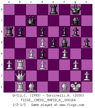 Last move : 1/2-1/2 2014 August 28 2:45:12 [Event "FICGS__CHESS__RAPID_A__000164"] [Site "FICGS"] [Date "2014.08.02"] [Round "1"] [White "Ortiz,Clodomiro"] [Black "Sorcinelli,Andrea"] [Result "1/2-1/2"] [WhiteElo "1993"] [BlackElo "2030"] 1.c4 c5 2.Nf3 Nc6 3.e4 e5 4.Nc3 d6 5.g3 g6 6.d3 Bg7 7.Bg2 Nge7 8.O-O O-O 9.a3 Nd4 10.Nxd4 cxd4 11.Nd5 Nxd5 12.exd5 Bf5 13.f4 f6 14.b4 a5 15.Rb1 Qd7 16.Bf3 h5 17.bxa5 Rxa5 18.Rb6 Ra6 19.Rb3 b6 20.Qc2 Re8 21.Re1 Rea8 22.Bg2 Rc8 23.Qb2 Qc7 24.Bd2 Re8 25.Rb1 Qe7 26.Bf1 Rb8 27.Bc1 Qc7 28.Qf2 Re8 29.Qb2 Rb8 30.Qf2 Re8 31.Qb2 1/2-1/2 English : Symmetrical variation Kingside Castling by player White (move 8) Kingside Castling by player Black (move 8) This chess game ended in a draw. Follow this game move after move (download)I don't believe in psychology. I believe in good moves. (Bobby Fischer) Glücklicherweise sind Großmeister Ruben Fines reine Schachbücher weniger phallozentrisch [als seine Schachpsychologie] und deswegen auch weniger lächerlich. (Nigel Short) Si yo gano un torneo, yo lo gano por mí mismo. Yo hago las jugadas. Nadie me ayuda. (Bobby Fischer) Seul un grand joueur sait à quel point il joue faiblement. (Xavier Tartacover) Never risk one's whole fortune unless supported by one's entire army. (Niccolo Machiavelli)